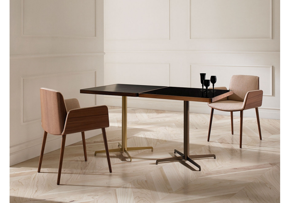 Hug designed by Manel Molina for Punt is a chair with structure and legs in walnut or oak veneered wood and upholstery in fabric or leather. Available in different finishes.