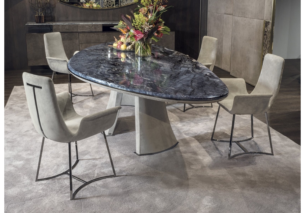 Coral designed by Giuseppe Viganò for Longhi is a chair with internal structure in cold molded foamed iron. External structure in metal with galvanic finish and non-removable leather covering.