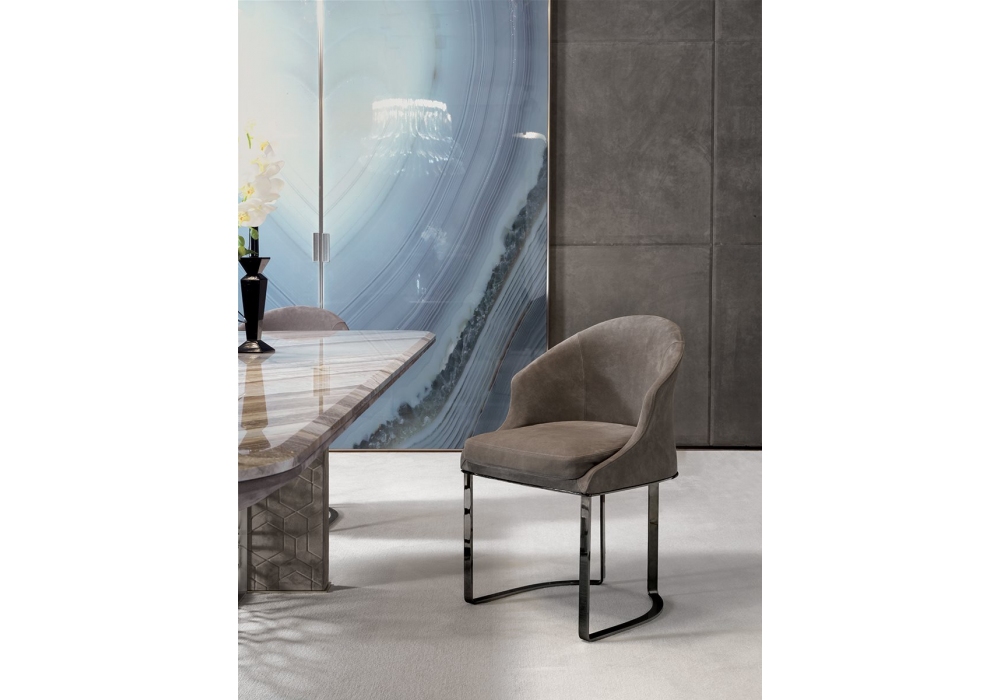 Daphne designed by Giuseppe Iasparra for Longhi is a chair with structure in glossy or matt metal and non-removable leather or velvet covering. Available in different finishes.