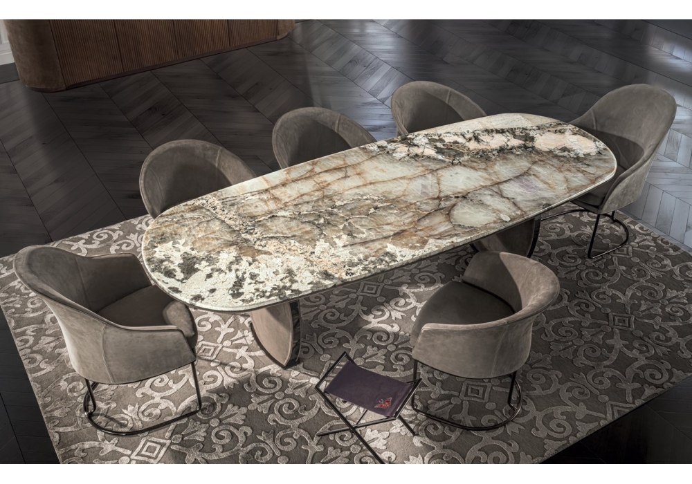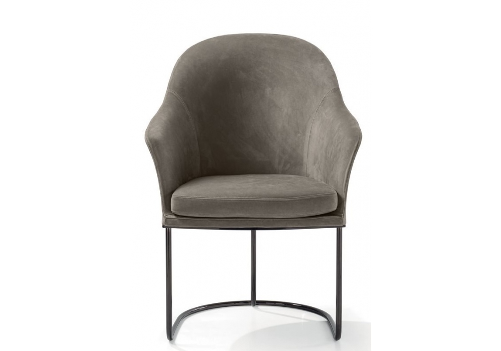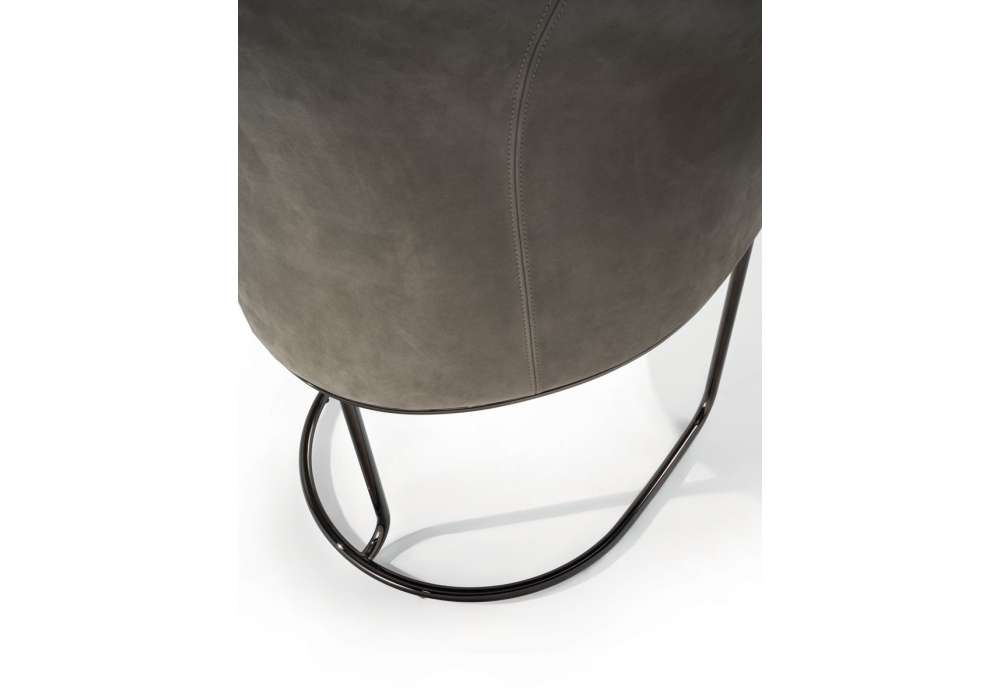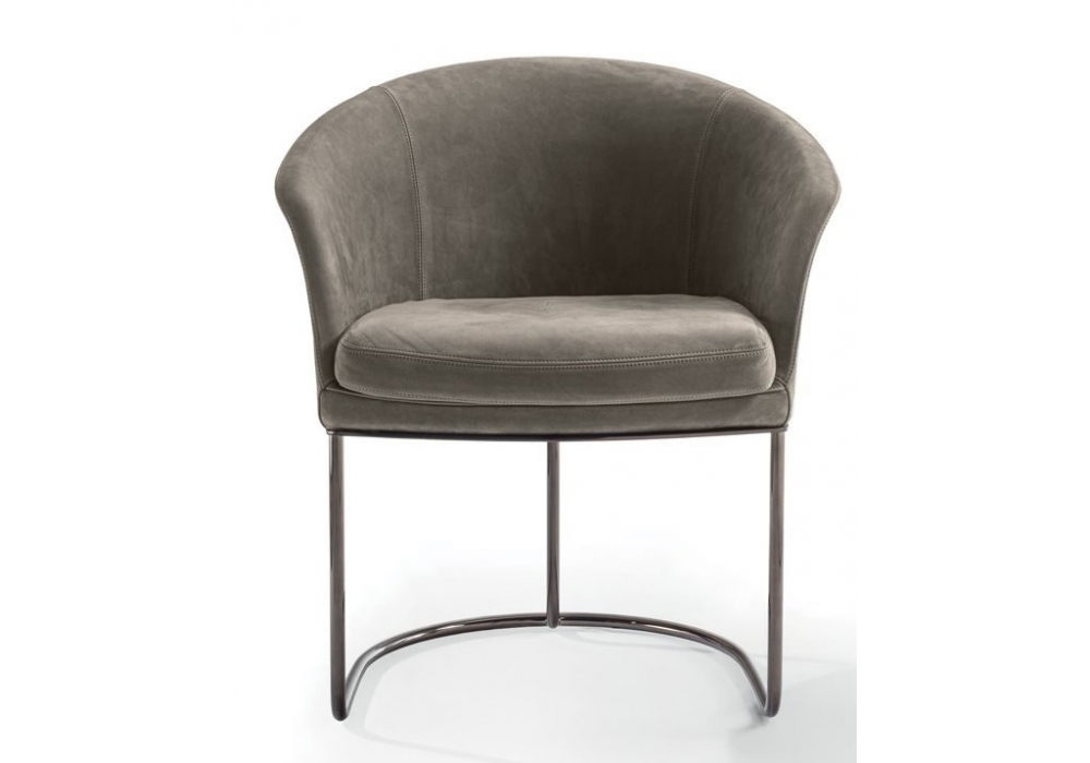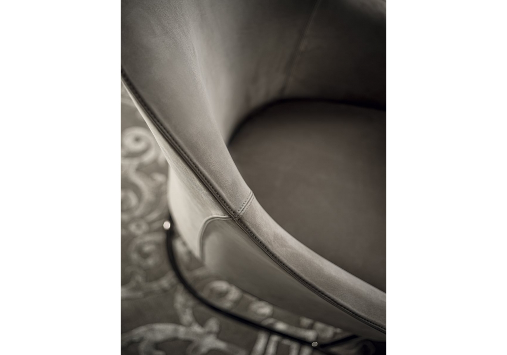 Lily designed by Giuseppe Iasparra for Longhi is a chair with curved tubular metal base, assembled with a lasered metal plate in glossy or matt finish. Internal structure in cold molded foam covered in non-removable fabric or leather. Seat cushion in double density polyurethane foam with removable cover. Available in two dimensions.