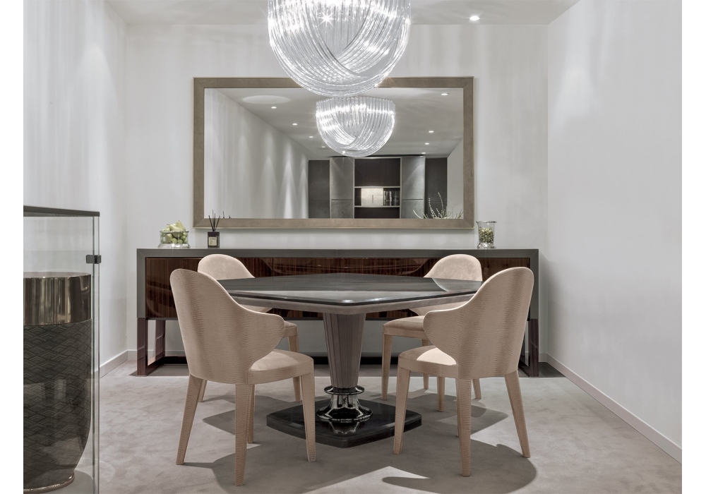 Miss designed by Giuseppe Viganò for Longhi is a chair with wooden structure with elastic straps and plywood backrest