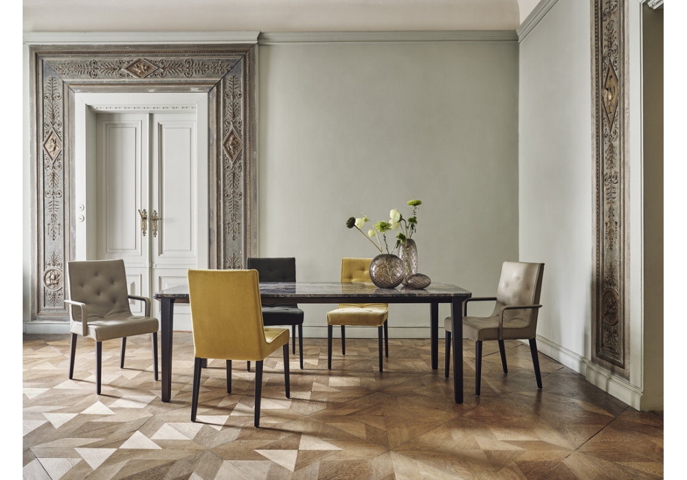 Leslie designed by Soda Designers - Nasrallah & Horner for Wittmann is a chair with structure in wood and metal with upholstery in fabric, velvet or leather. Available in two versions with armrests and without armrests and in different finishes.