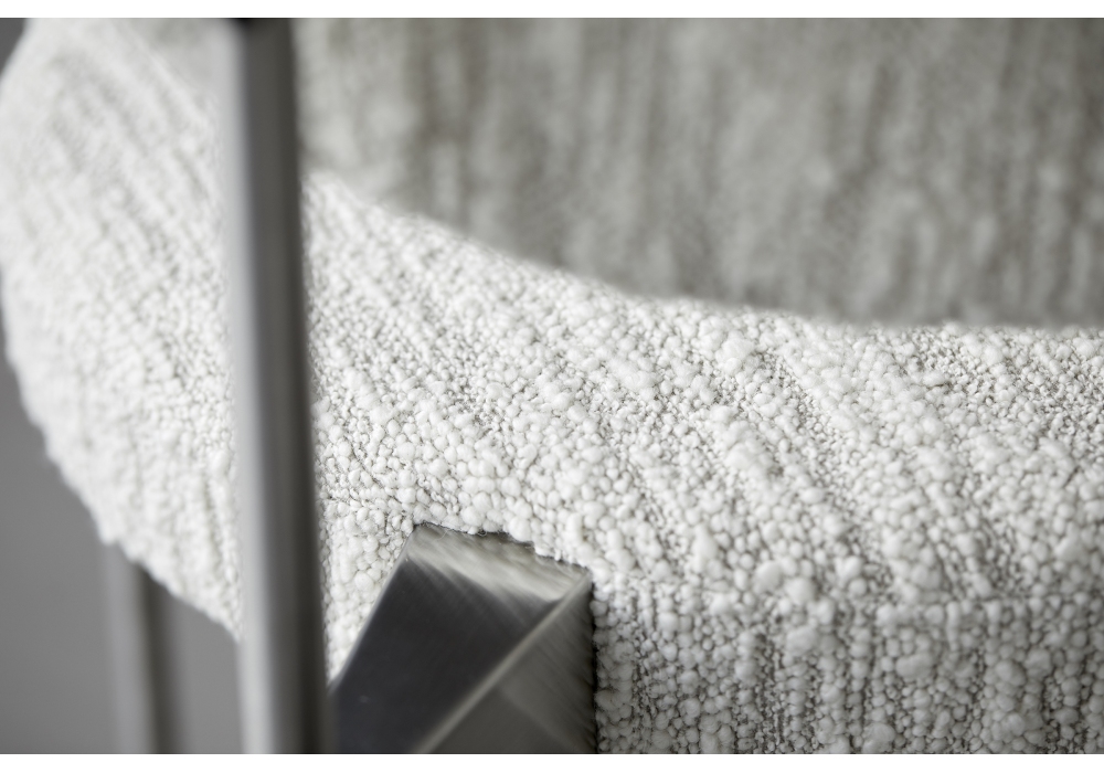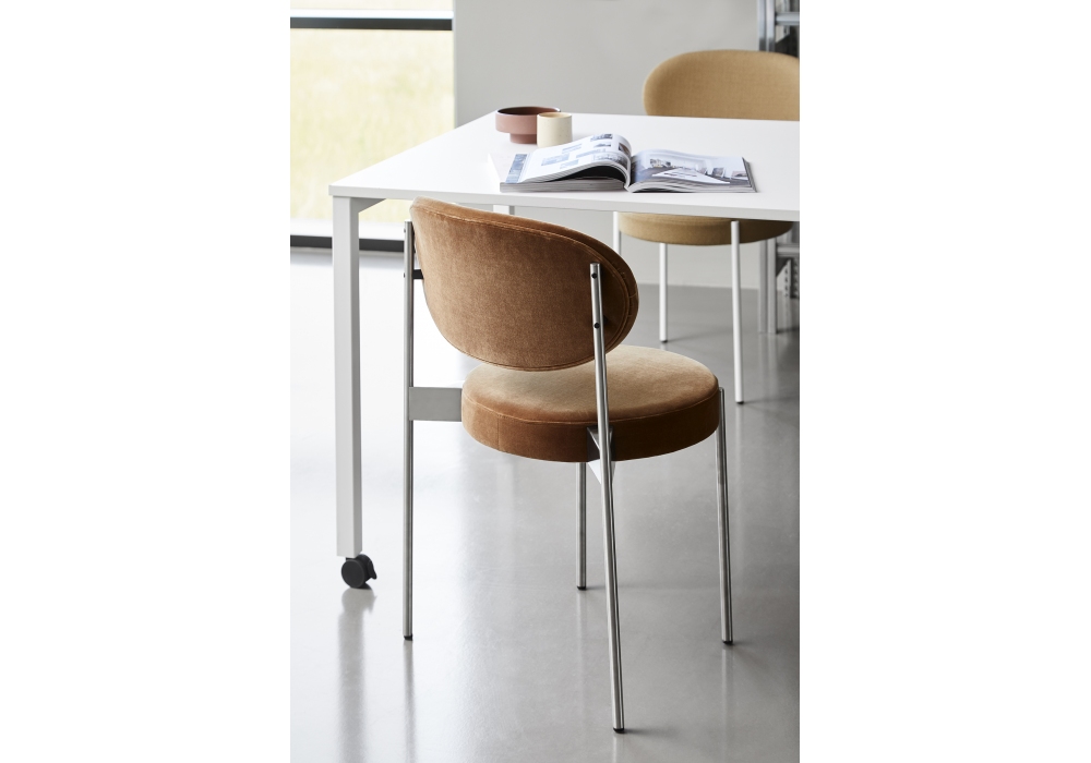 Series 430 designed by Verner Panton for Verpan is a stackable chair fully upholstered and upholstered in different fabrics or leathers. Brushed steel structure with felt feet.