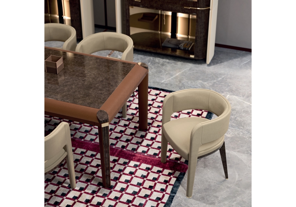 Eclipse designed by Andrea Bonini for Turri is a chair with structure in solid wood and plywood with hand-decorated finish in glossy polyester. Non-removable cover in fabric or leather and metal details in light gold finish.