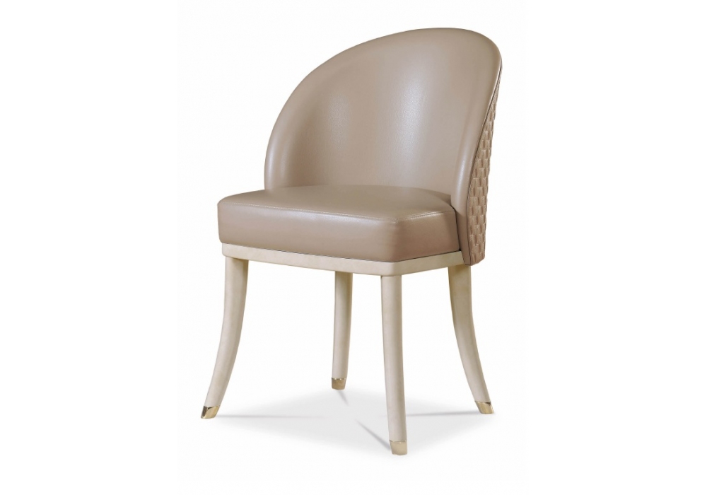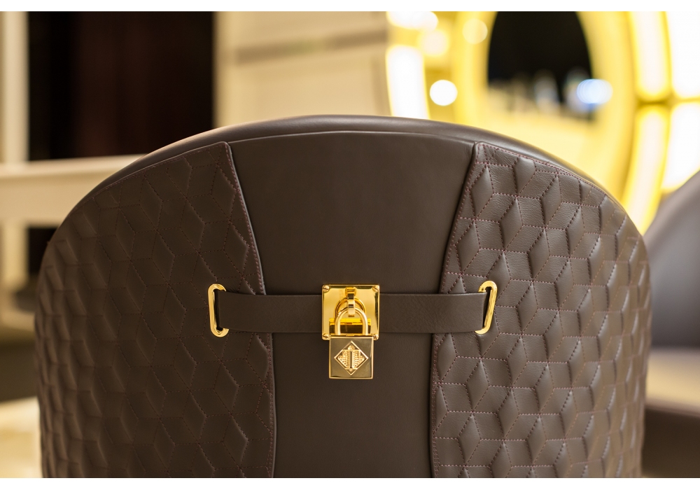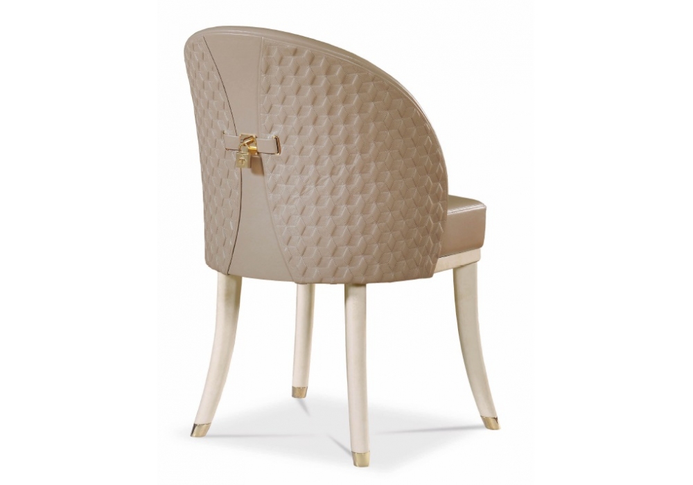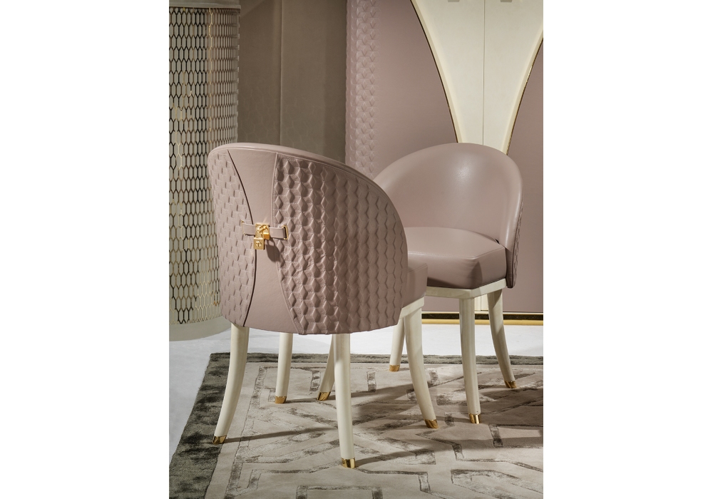 Vogue designed by Andrea Bonini for Turri is a chair with solid wood structure with hand-decorated glossy polyester finish. Upholstery in non-removable leather or fabric with backrest with hexagon embroidery. Metal parts in gold finish. Available in the version with high or low backrest.