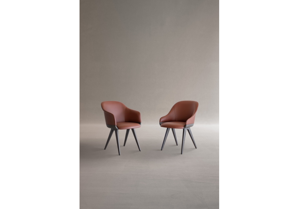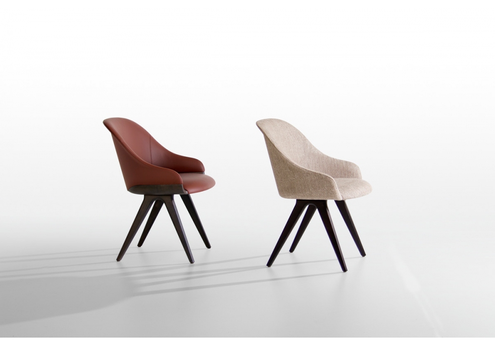 Lyz designed by Mario Ferrarini for Potocco is a dining chair with seat and back upholstered in fire retardant polyurethane foam with covering in different leathers, fabrics or eco-leathers and insert in solid ash or American walnut at the base of the seat.