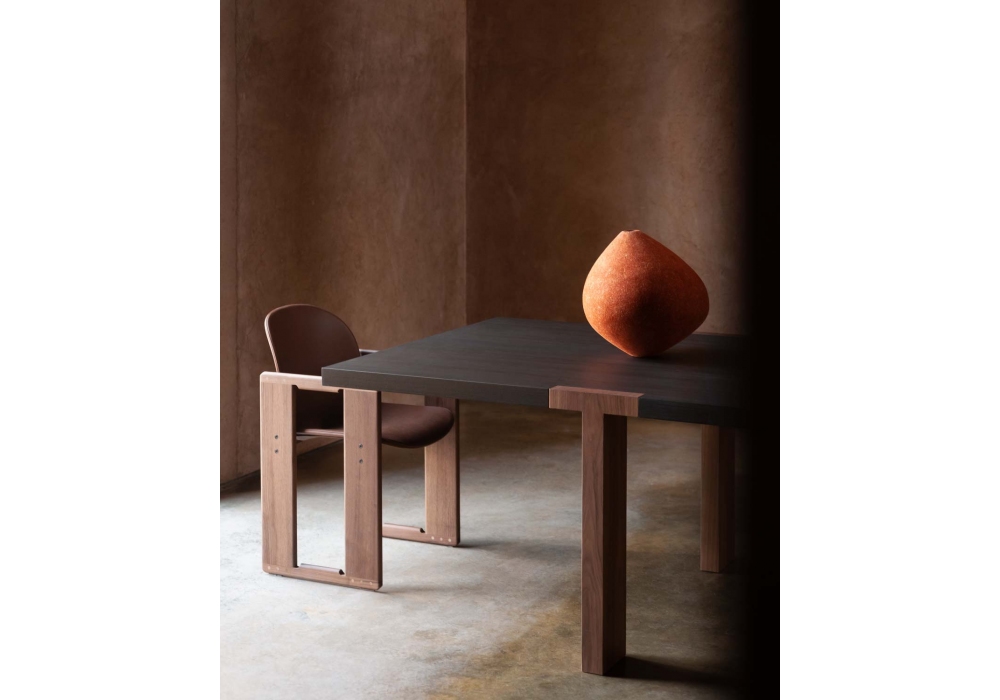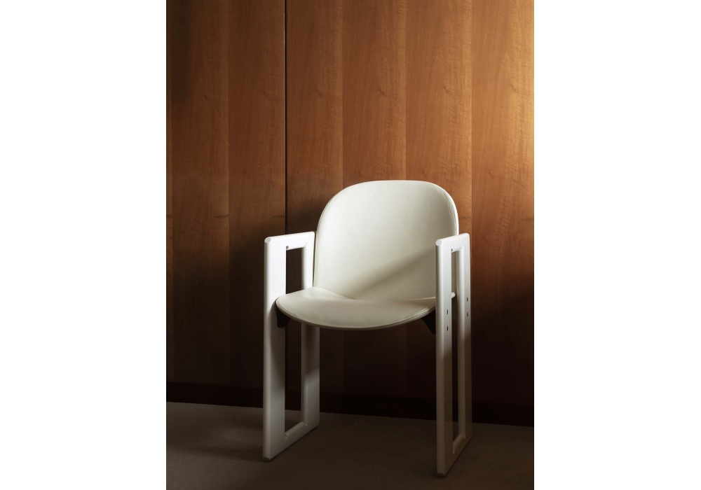 Dialogo designed by Tobia Scarpa for Tacchini is a chair with a rectangular structure with rounded edges in stained ash wood, Canaletto walnut or glossy lacquer. The seat is covered with various fabrics.