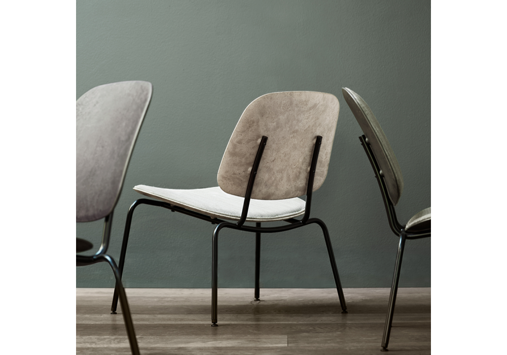 Compound designed by OEO Studio for Mater is a lounge chair with steel legs in black finish, seat and backrest in Matek®, in different finishes, upholstery available in fabric or leather.