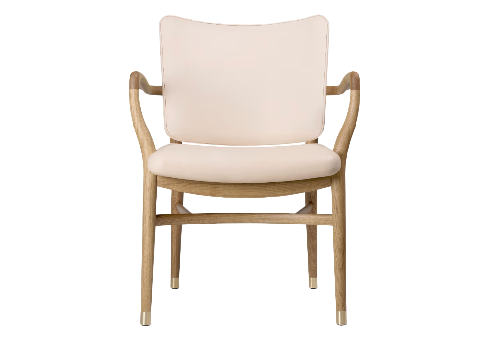 VLA61 Monarch Chair designed by Vilhelm Lauritzen for Carl Hansen & Søn is a chair with a solid oak or mahogany frame in various finishes and brass feet. Seat and backrest in foam with fabric or leather upholstery.