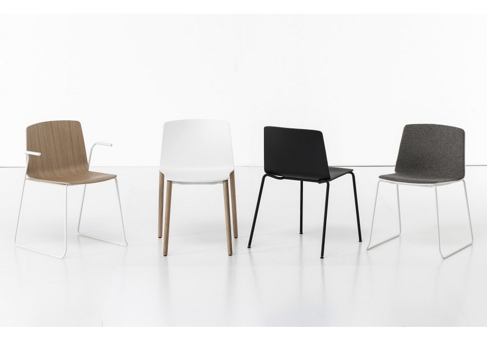 Rama designed by Ramos-Bassols for Kristalia is a chair with steel sled frame available in different finishes, polypropylene or wooden shell with fabric or leather front upholstery.