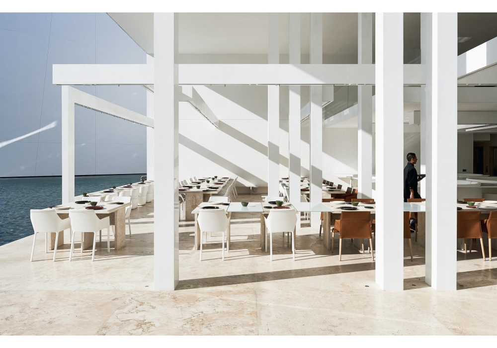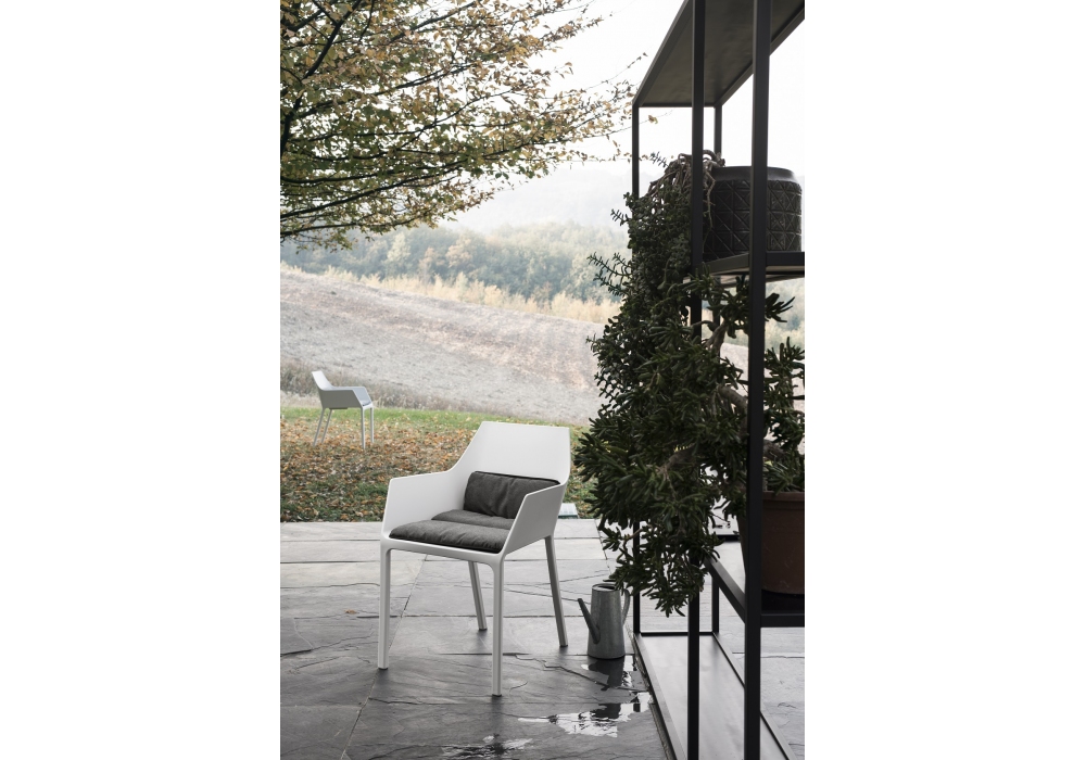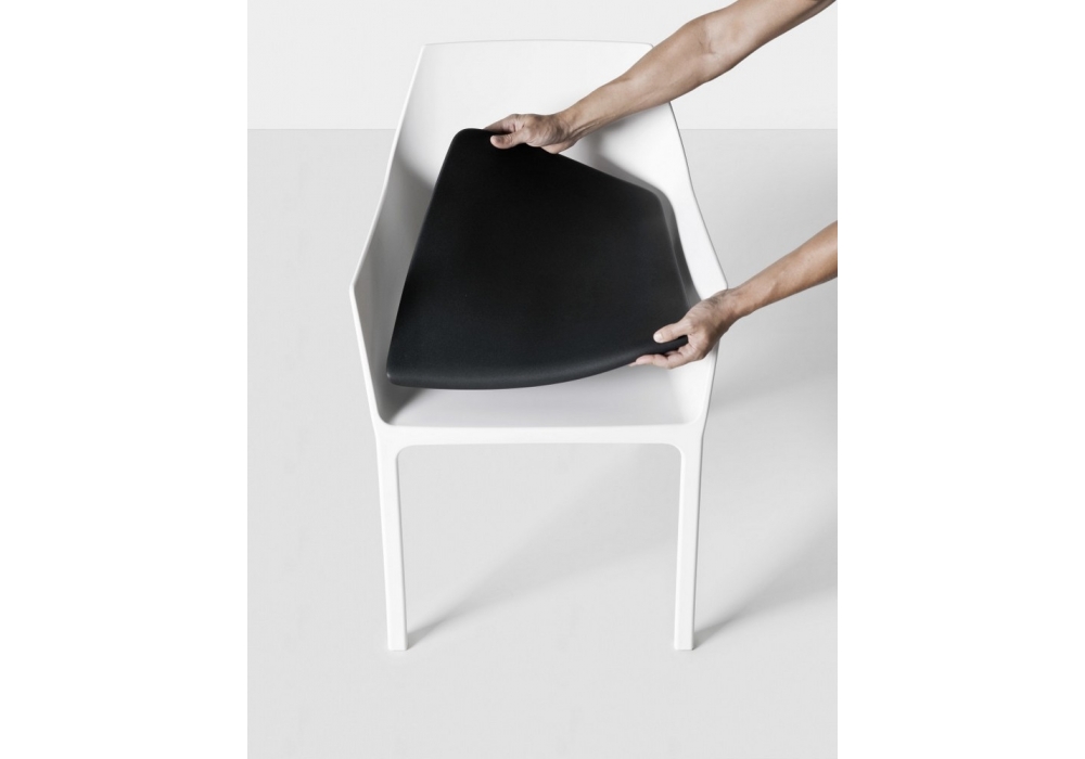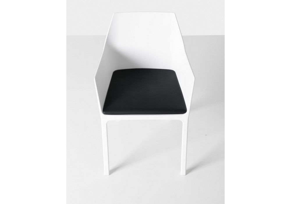 Mem designed by Christophe Pillet for Kristalia is a chair with armrest. The characteristic feature of this chair is bi-injection, a process which renders it stiff, keeping this seat in its absolutely beautiful form. The skin is pleasingly uniform and covers every face and vertex of the piece. Christophe Pillet has sculpted a chair with armrest for Kristalia, suited also to use inside, perhaps in a modern office or flat, as well as in a garden or on the patio of an al fresco restaurant. The chair is visually striking, not in colour, for it is both sensibly and starkly monochromatic, but in form: the arms sweep out at 20 degrees, while the trapezoidal shape of the rear legs is engaging as a play upon perspective as all four legs can be easily seen from the front. A modern seat, its name is inspired by an ancient sound: Mem; its import is ‘water’ in the tongue of ancient Egypt. This plastic chair with an armrest is made from reinforced polypropylene with glass and print injected into it, giving great resistance with an elegant design of cleverly accented angles and curves. The characteristic feature of this chair is bi-injection, a process which renders it stiff, keeping this seat in its absolutely beautiful form. The skin is pleasingly uniform and covers every face and vertex of the piece. This sculptured plastic chair with ergonomic armrest is also valuable in outdoor spaces, a quality piece of furniture for hotels, museums, offices and the like, already used to add to choice modern contexts as far afield as Central Asia and Norway. It comes with removable cushions of soft and flexible polyurethane in the same colours as the seat: these provide a touch more comfort.