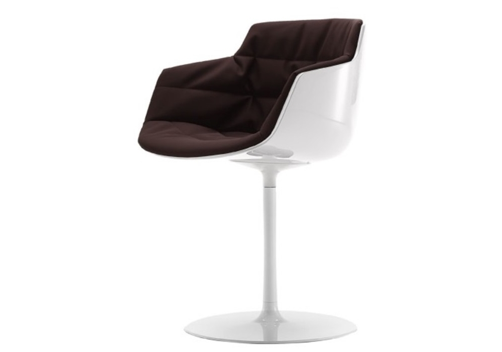 Flow Slim is a family of seating of great impact and comfort. Designed for the home, the office and the community areas. Available in a wide range of bases and finishes. White or black polycarbonate shell - with a padded shell, a thermoformed padded countershell with a small pad made from quilted polyurethane and polyester wadding. Chair with 360° swivel base with central leg inaluminium, painted gloss white or mattgraphite grey.