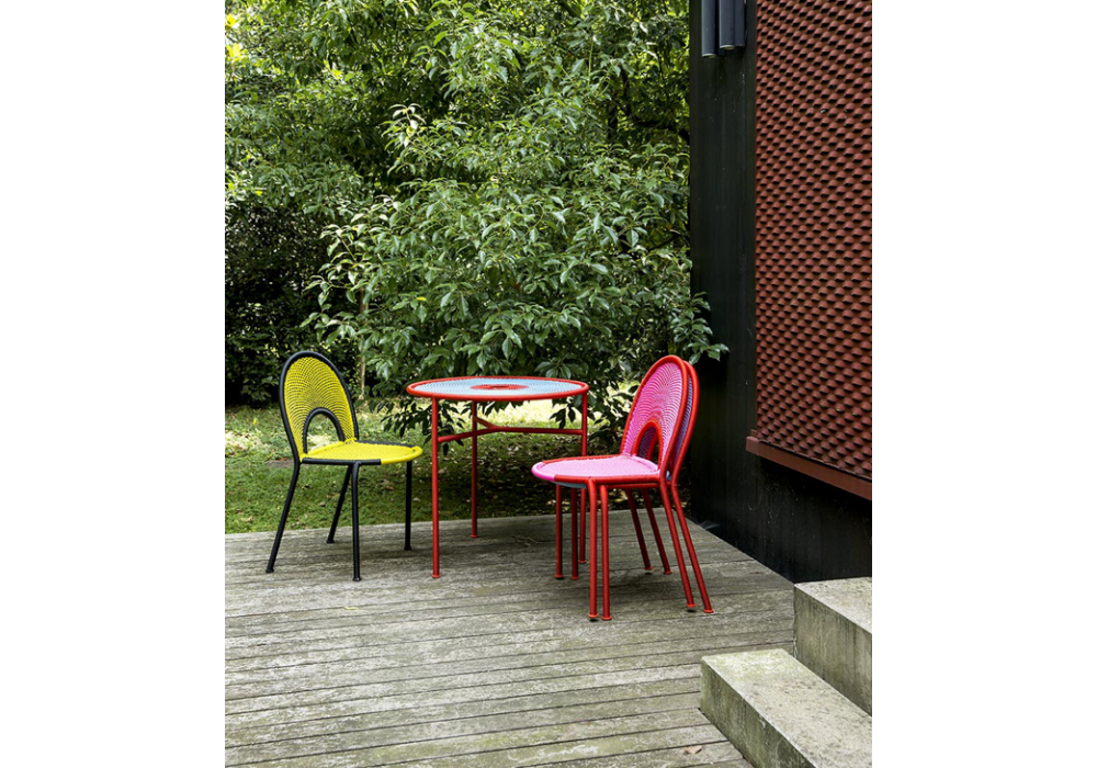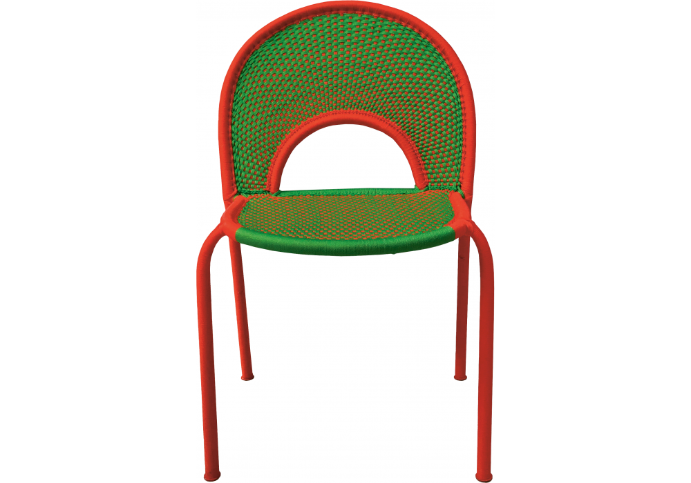 Banjooli designed by Sebastian Herkner for Moroso is a chair with painted steel structure and colored hand-woven polyethylene threads. PVC insoles.