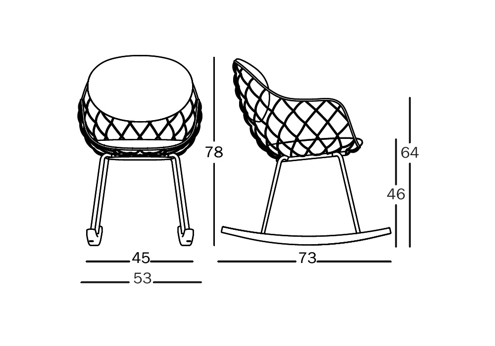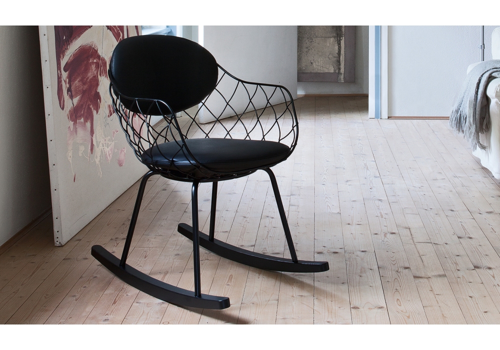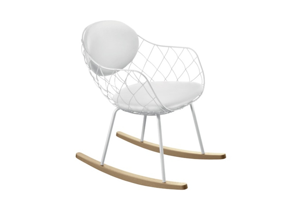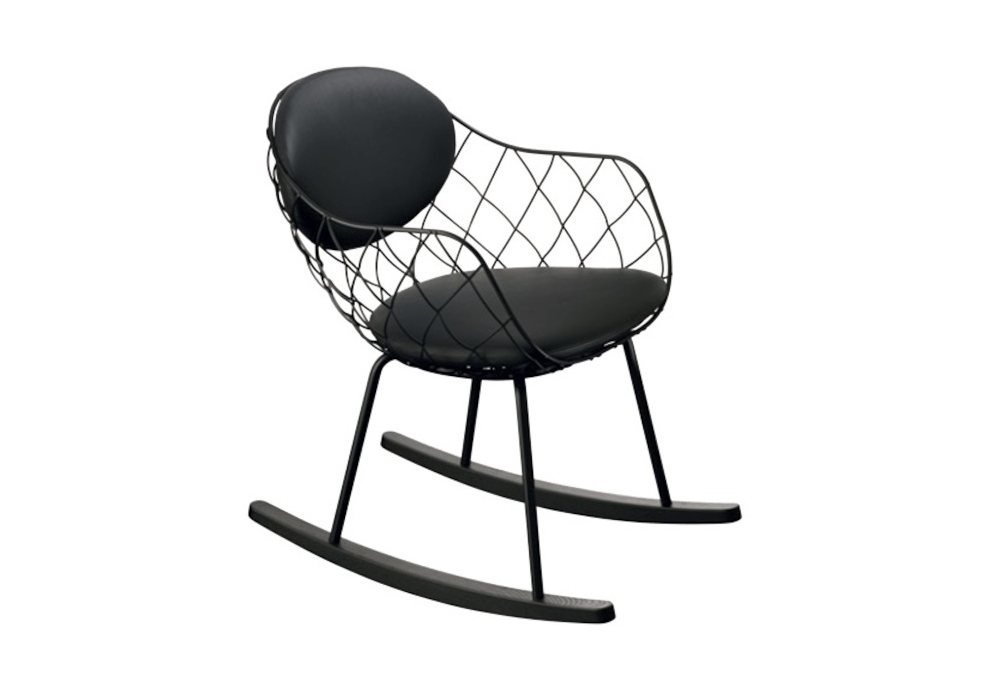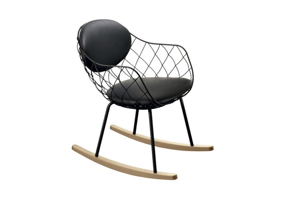 Piña designed by Jaime Hayón for Magis is a rocking chair with structure in polyester painted steel tube. Body in steel rod painted in polyester powder. Glides in solid natural or painted ash. Seat / back cushion in removable polyurethane foam, covered in fabric or leather.