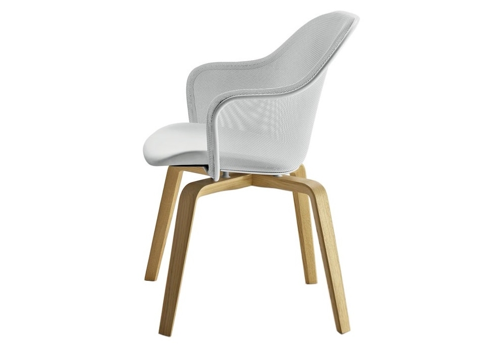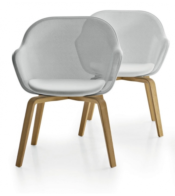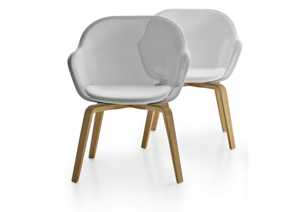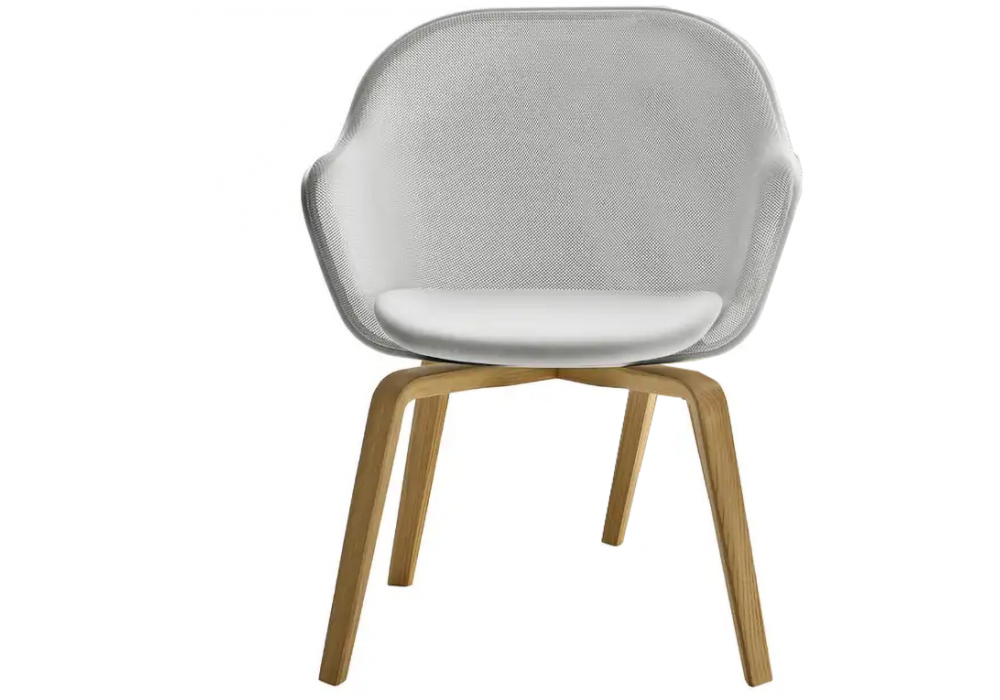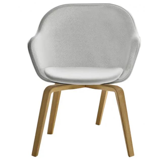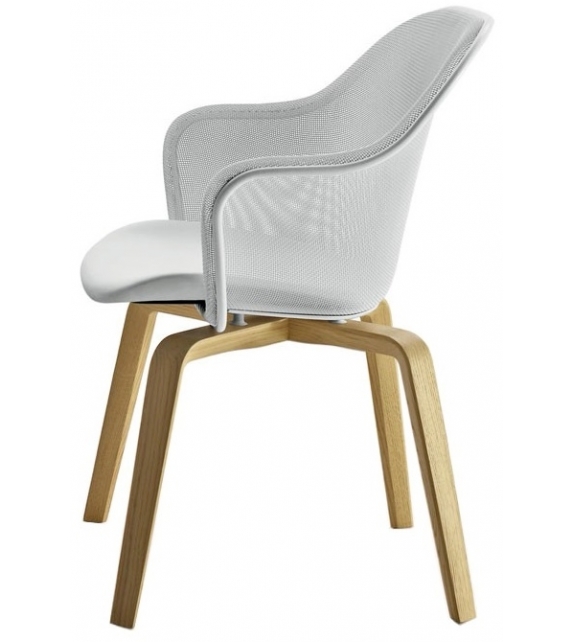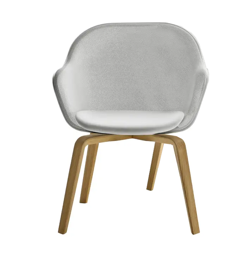 Iuta '14 designed by Antonio Citterio for B&B Italia is a chair with legs in solid oak, backrest with mesh in printed steel and perimeter profile in aluminum in different finishes. Upholstery in leather or fabric.