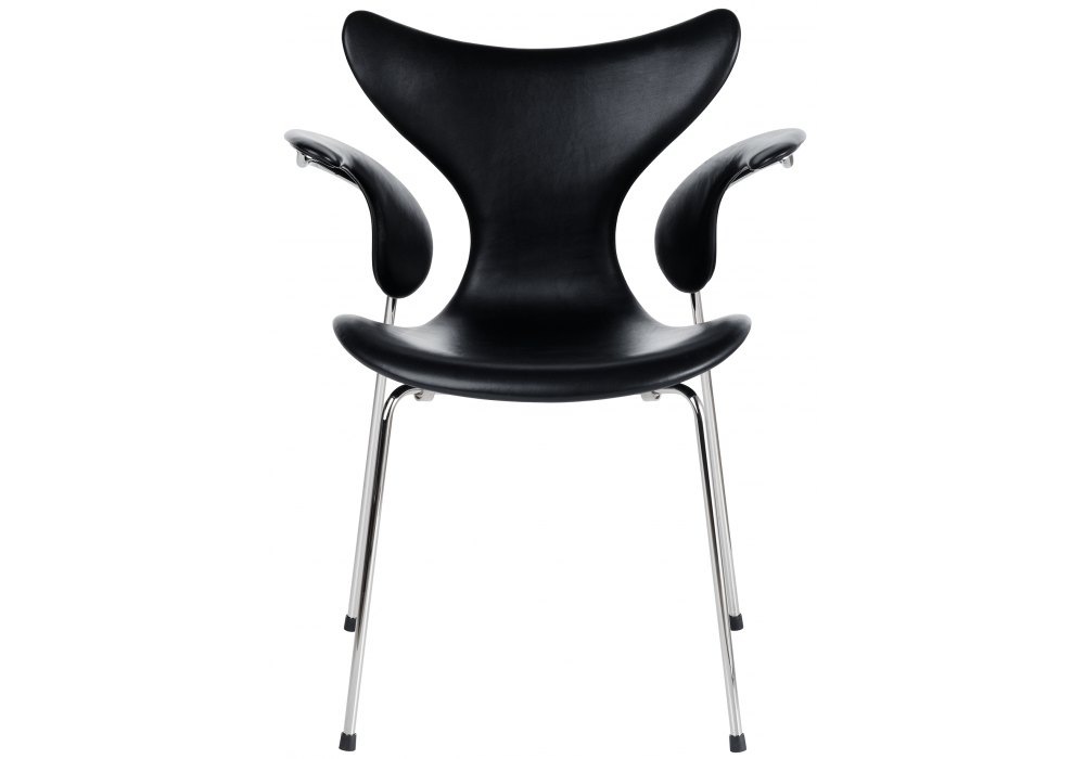 Lily designed by Arne Jacobsen for Fritz Hansen is a chair with armrests made with fabric or leather upholstery and 4 legs in chromed steel tubing.
