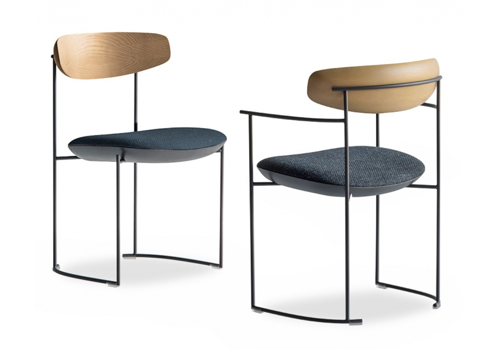 Keel Light designed by M + V for Potocco is a chair with structure in embossed painted metal rod, back in solid ash and seat in birch plywood strapped in fire retardant polyurethane foam covered in various fabrics, leathers or eco-leathers.