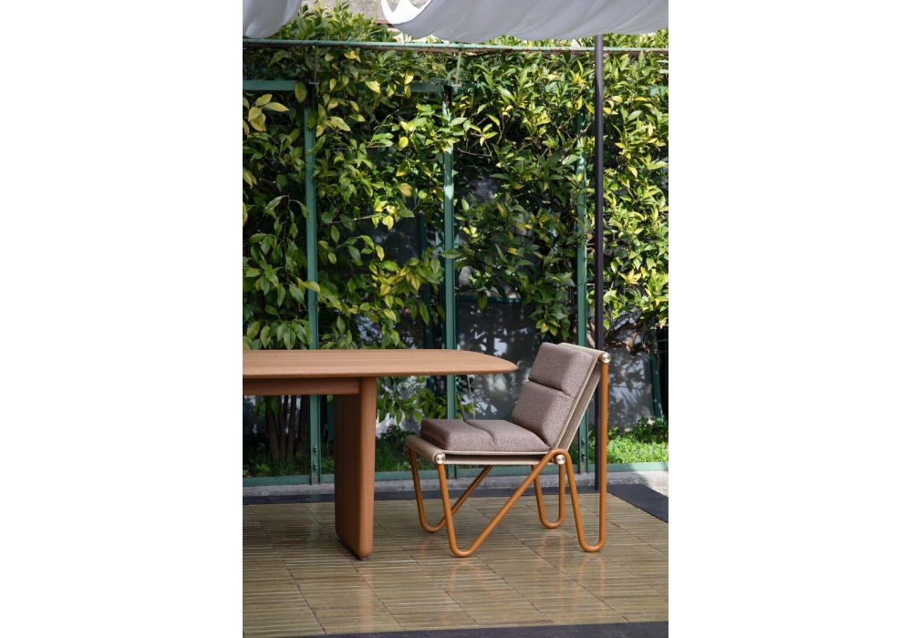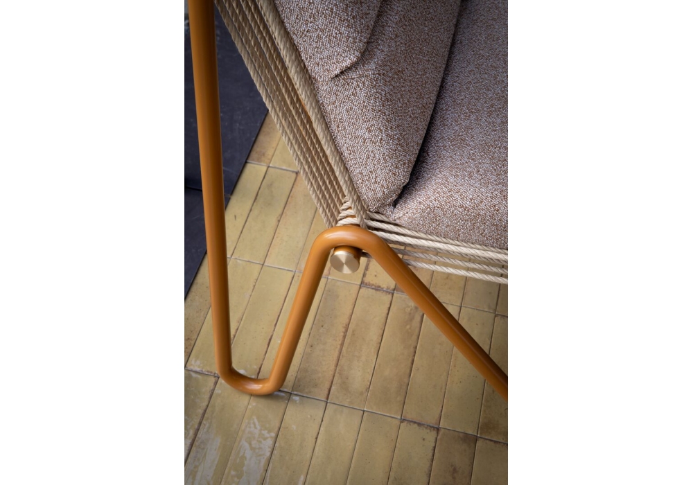 Dabliou Outdoor designed by Studiopepe for Baxter is a chair with structure in polished 316 stainless steel or powder-coated 316 stainless steel. Seat and backrest with natural-coloured paper cord weave. Padding in differentiated density polyurethane foam. Details in polished 316 stainless steel or satin brass.