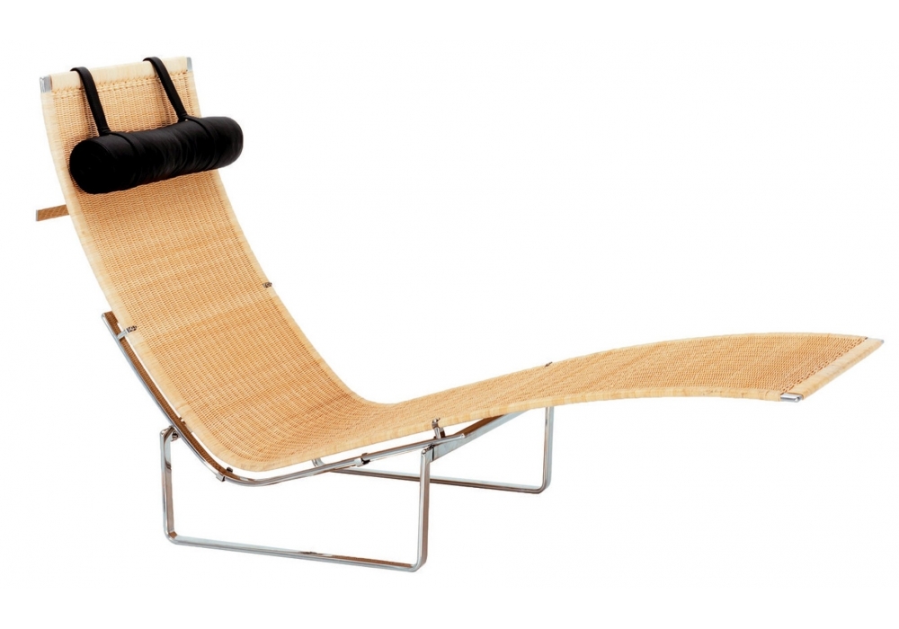 PK24™ designed by Poul Kjærholm for Fritz Hansen is a chaise longue made of wicker with base in satin stainless steel. Headrest in leather.