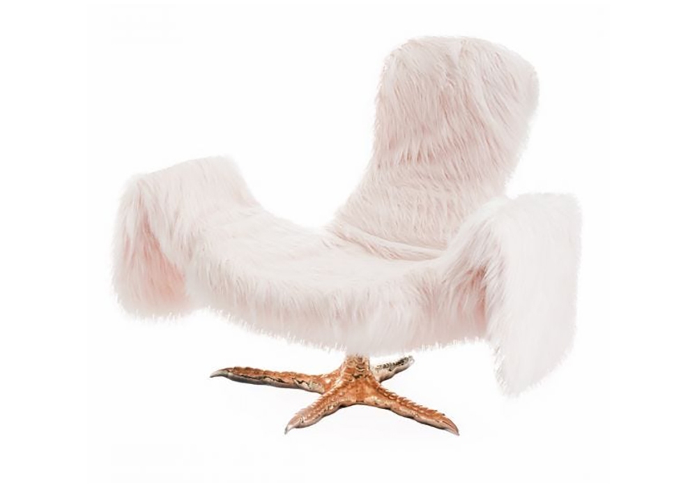 Cocky designed by Sfera Ebbasta for Driade is a chaise longue with structure in soft polyurethane, adjustable armrests, backrest and headrest, upholstery in long-haired eco-fur, base in cast aluminum painted in glossy gold or chromed steel. Internal use only.
