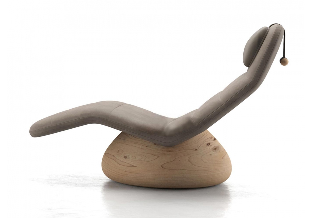 Totemica designed by Claudio Bellini for Riva 1920 is a padded chaise longue with ergonomic seat, has a wooden base, covered in leather or fabric. Available in different finishes.
