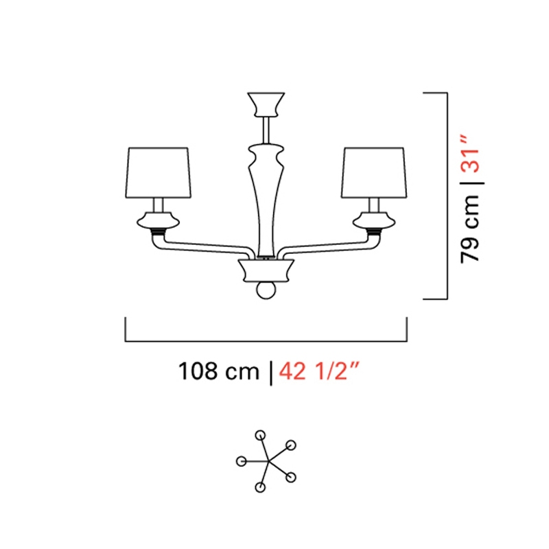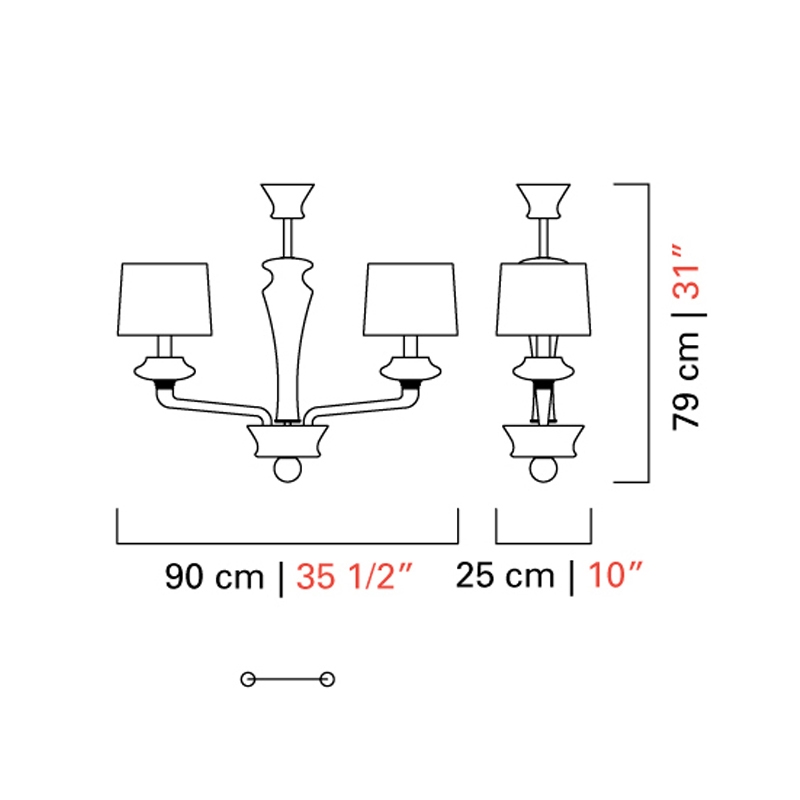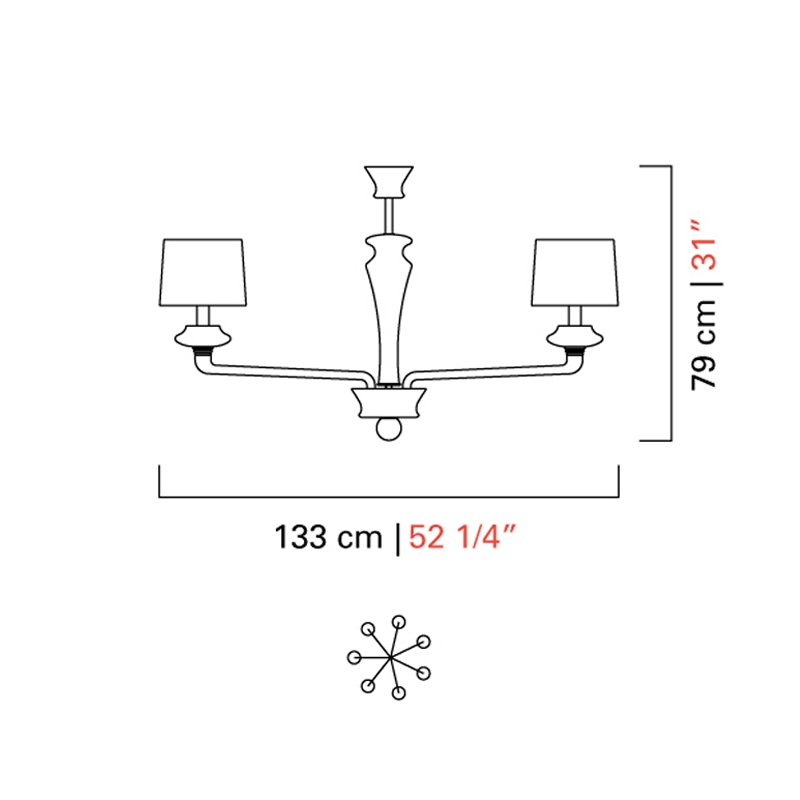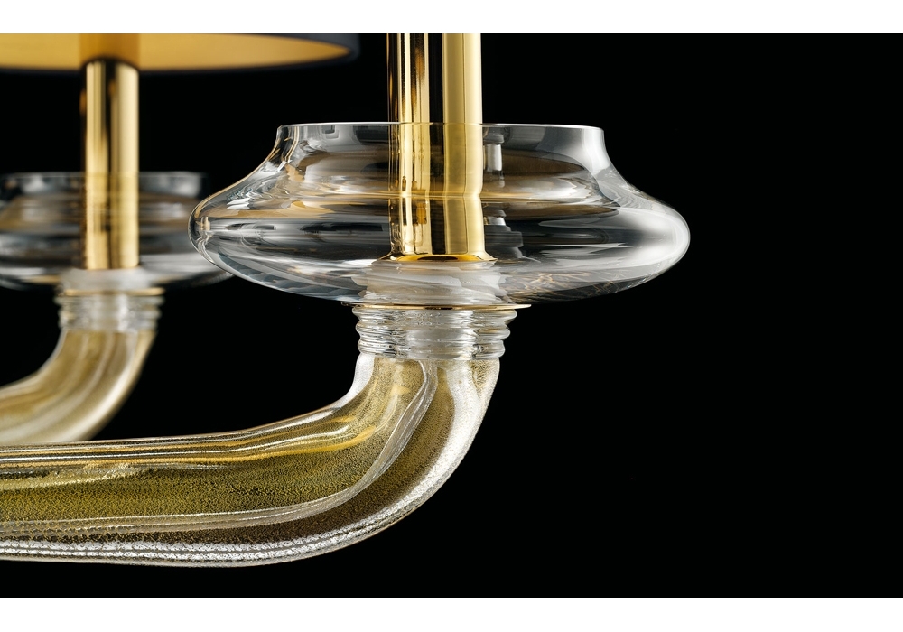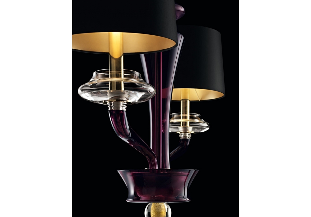 Saint Germain designed by Giorgia Brusemini for Barovier & Toso is a chandelier with supporting structure in metal covered in Venetian glass. The lampshades are in fabric and shield dimmable LED or halogen light sources. Saint Germain is available in different finishes.