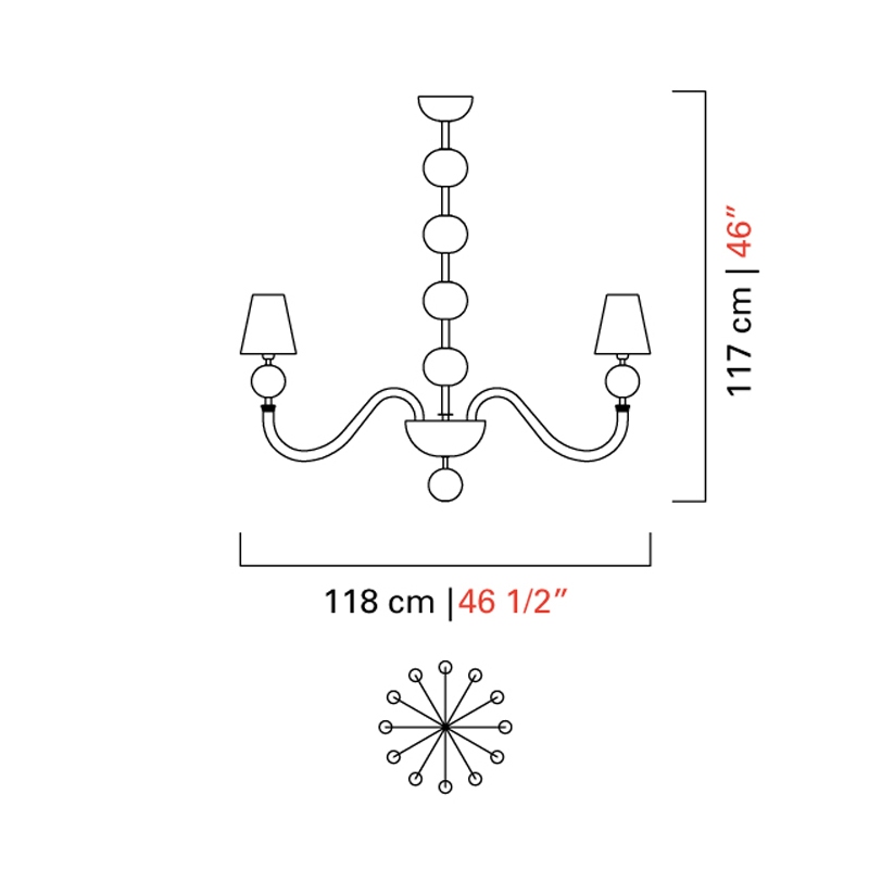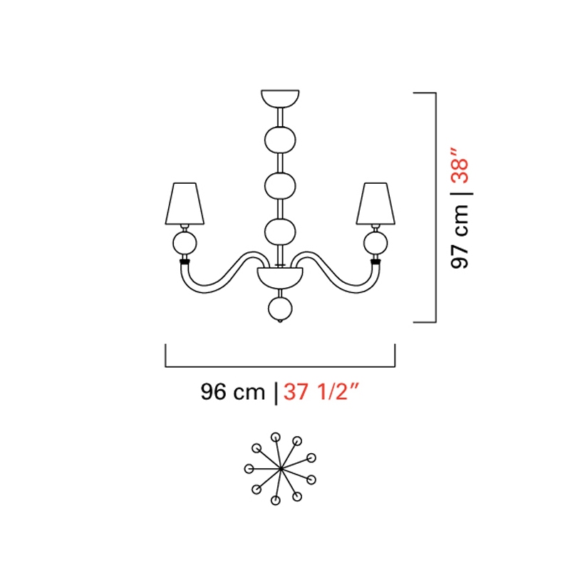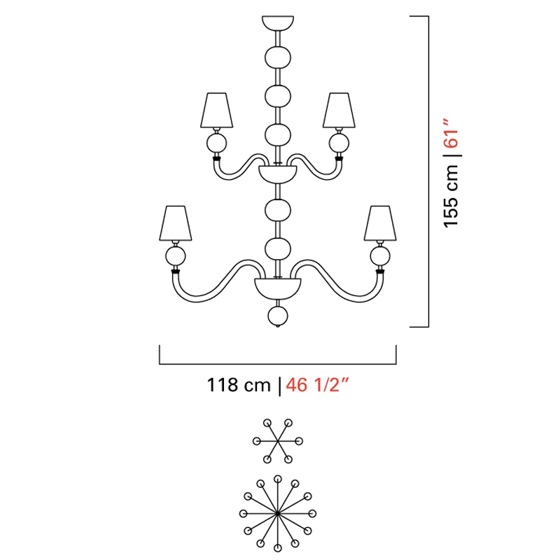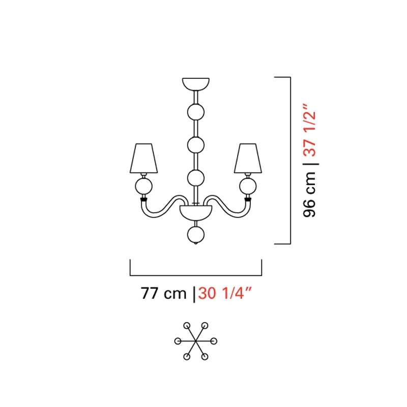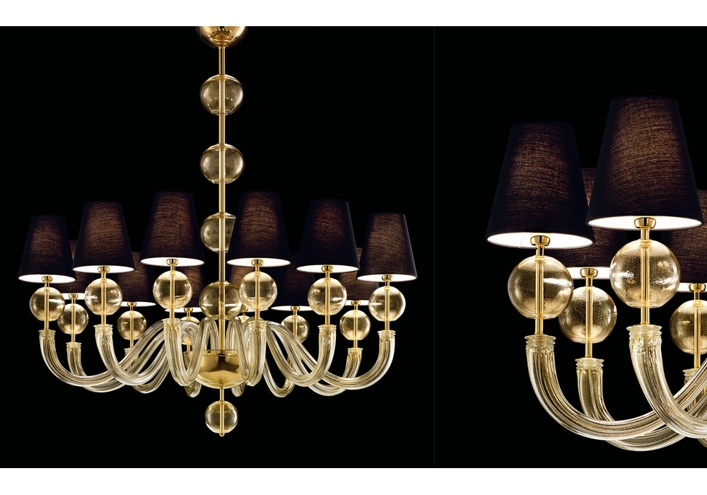 Vermont produced and designed by Barovier & Toso is a chandelier with supporting structure and details in metal covered in Venetian glass. The lampshades are in fabric and shield dimmable LED or halogen light sources. Vermont is available in different models and finishes.