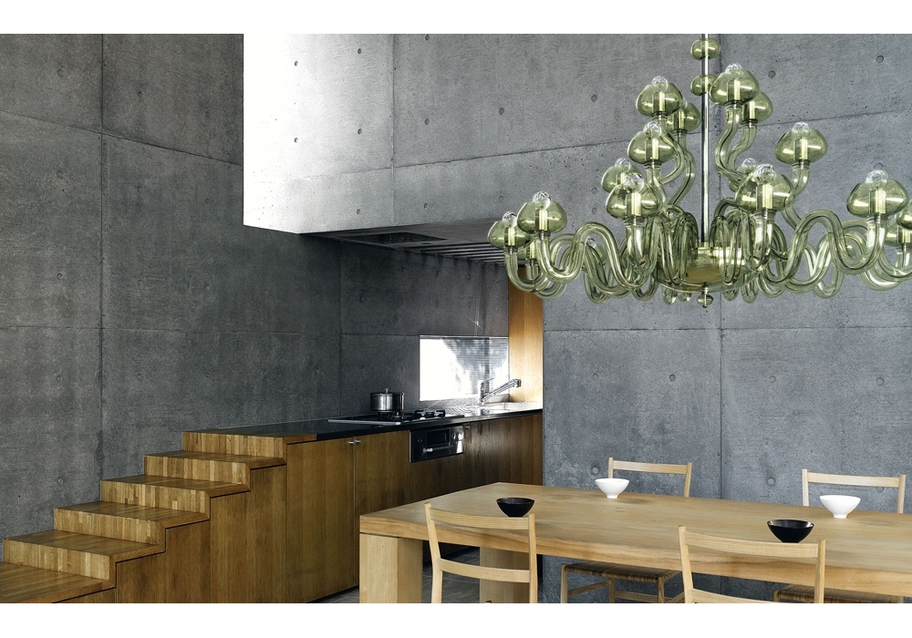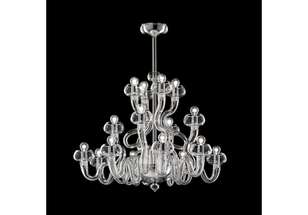 Bissa Boba designed by Angelo Barovier for Barovier & Toso is a chandelier with supporting structure and details in metal covered in Venetian glass. The diffusers are cup-shaped in Venetian glass and screen dimmable LED or halogen light sources. Bissa Boba is available in different models and finishes.