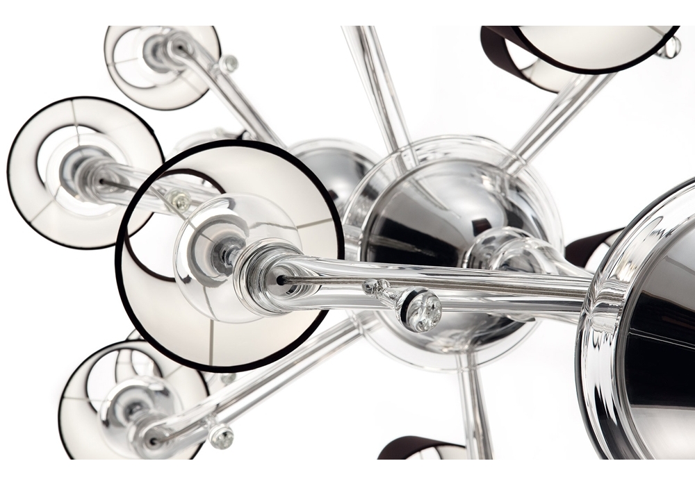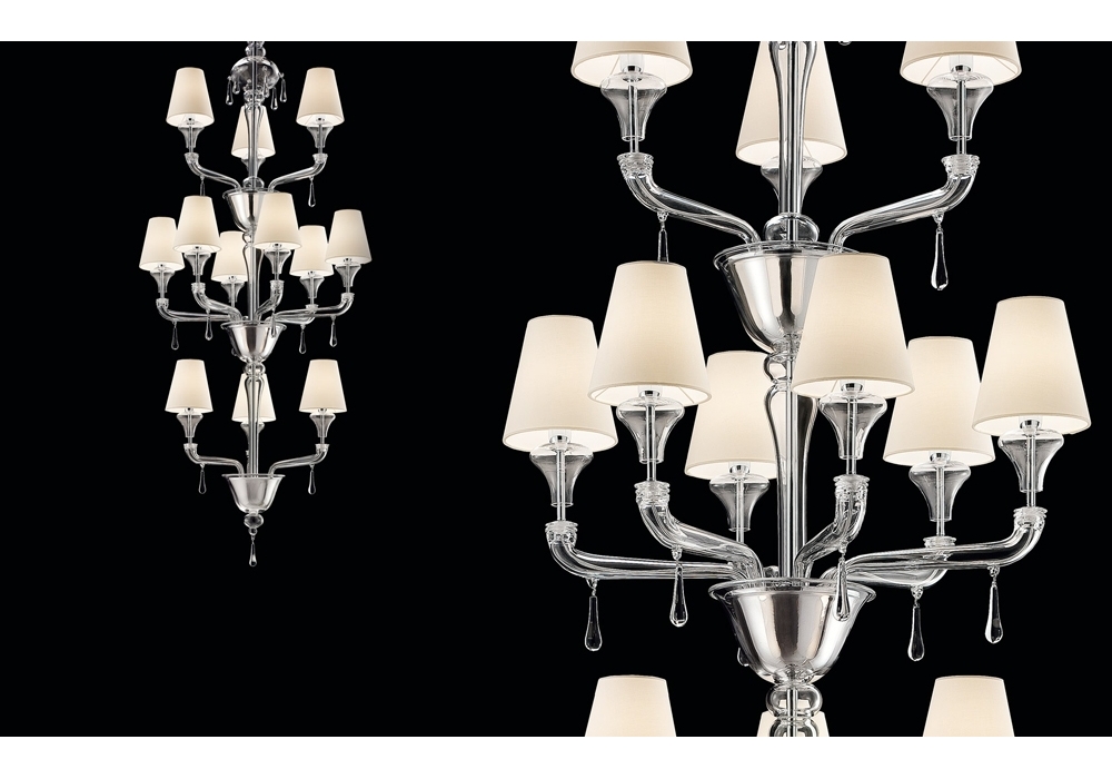 Torpedo Nevada designed and produced by Barovier & Toso is a chandelier structured with overlapping levels with a metal frame covered in Venetian glass. The arms support fabric lampshades with dimmable LED or halogen light sources. Torpedo Nevada is available in different models and finishes.