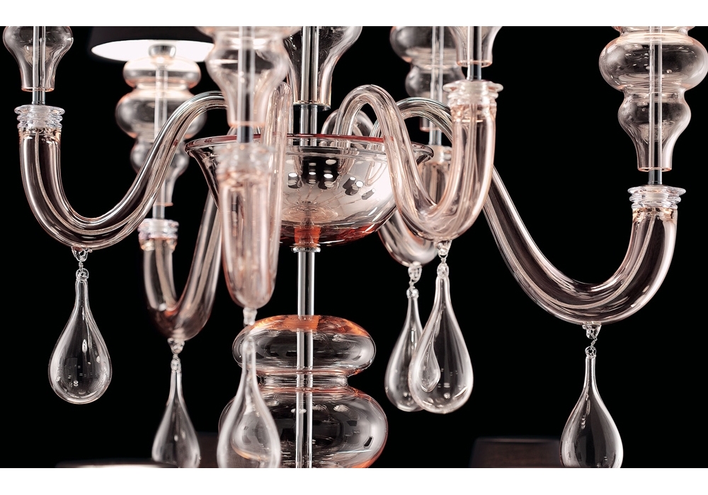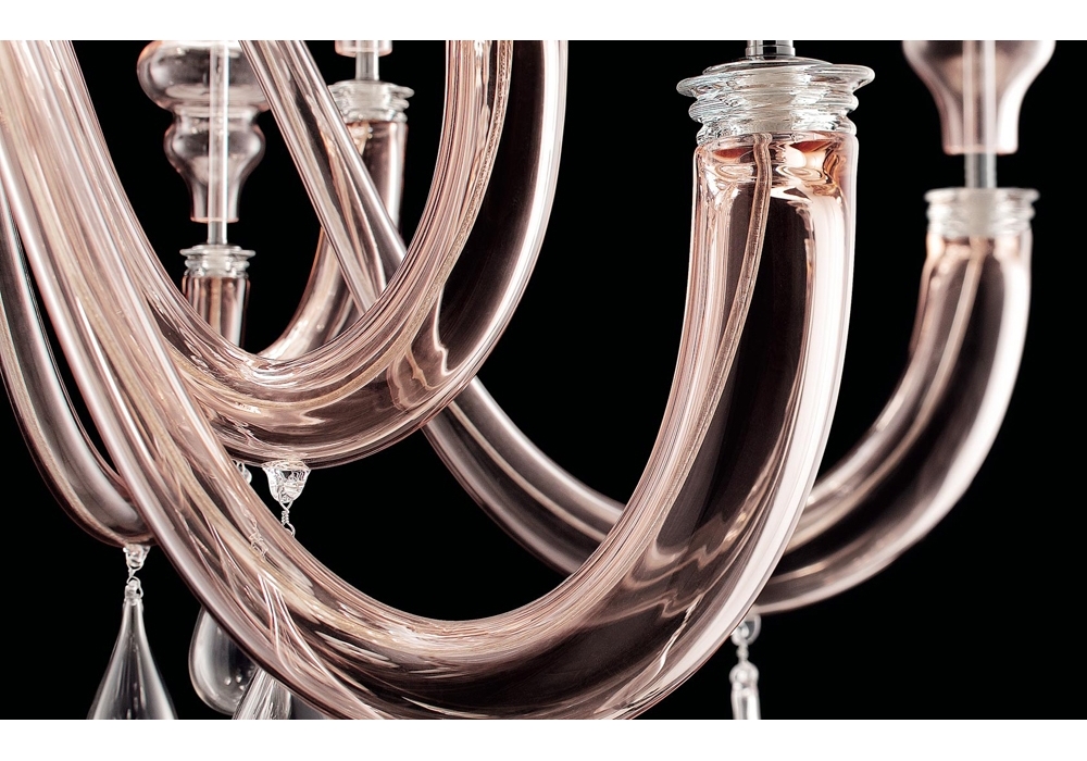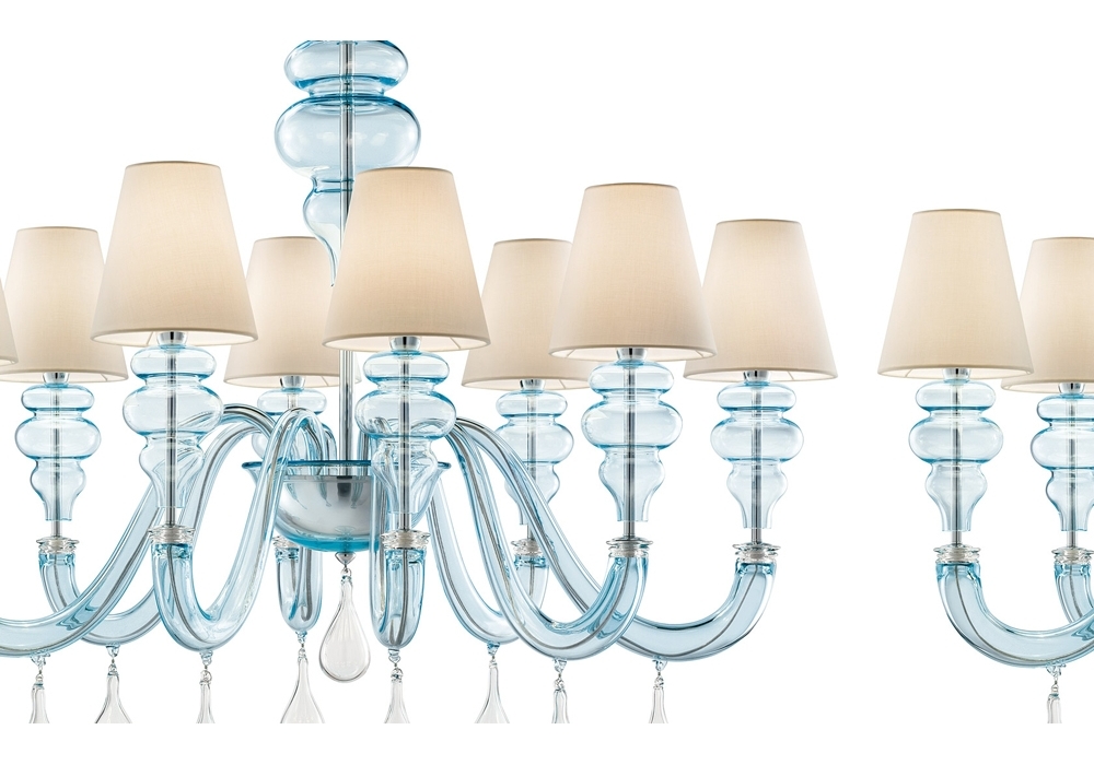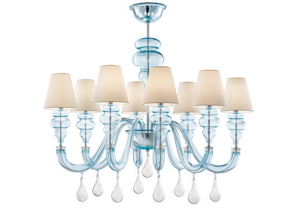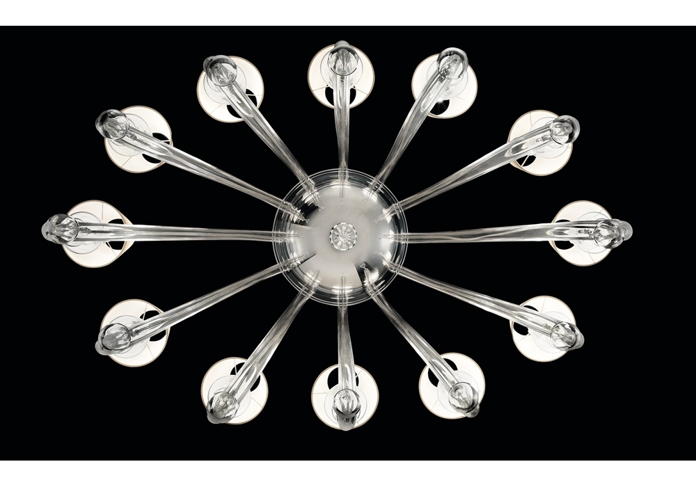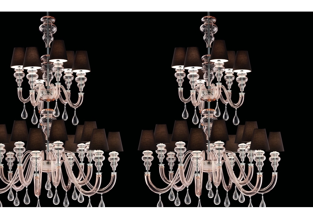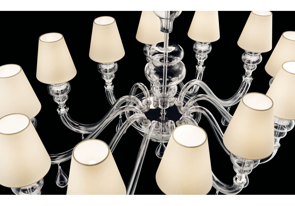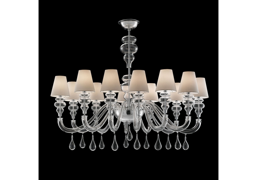 Ran Round designed and produced by Barovier & Toso is a chandelier structured with overlapping levels with a metal frame covered in Venetian glass. The arms support fabric lampshades with dimmable LED or halogen light sources. Ran Round is available in different models and finishes.