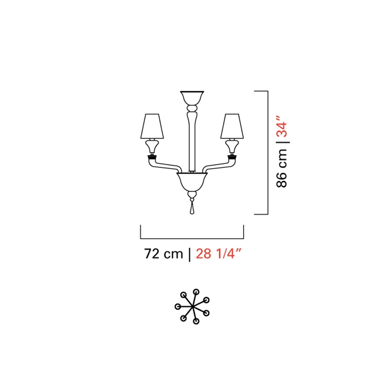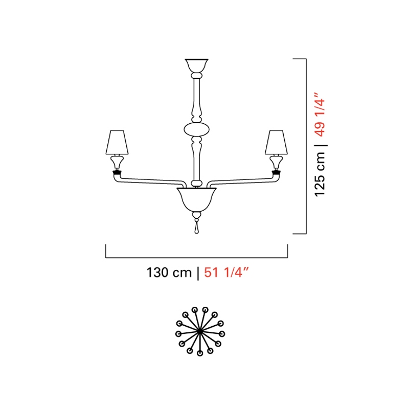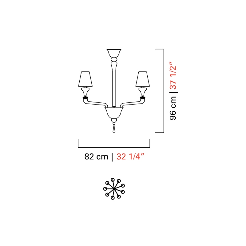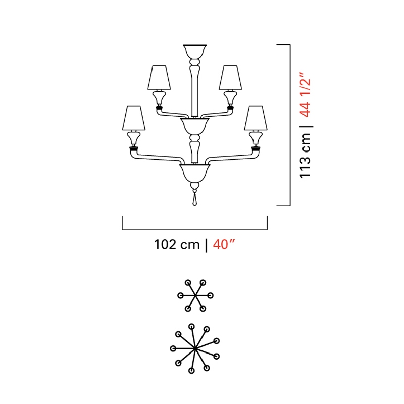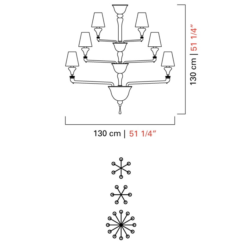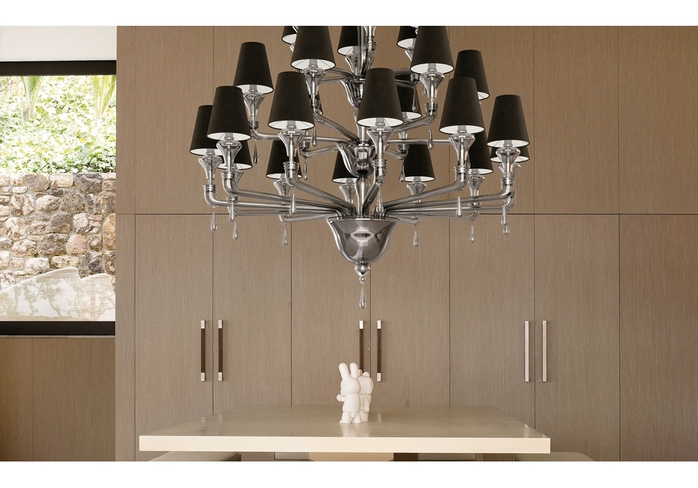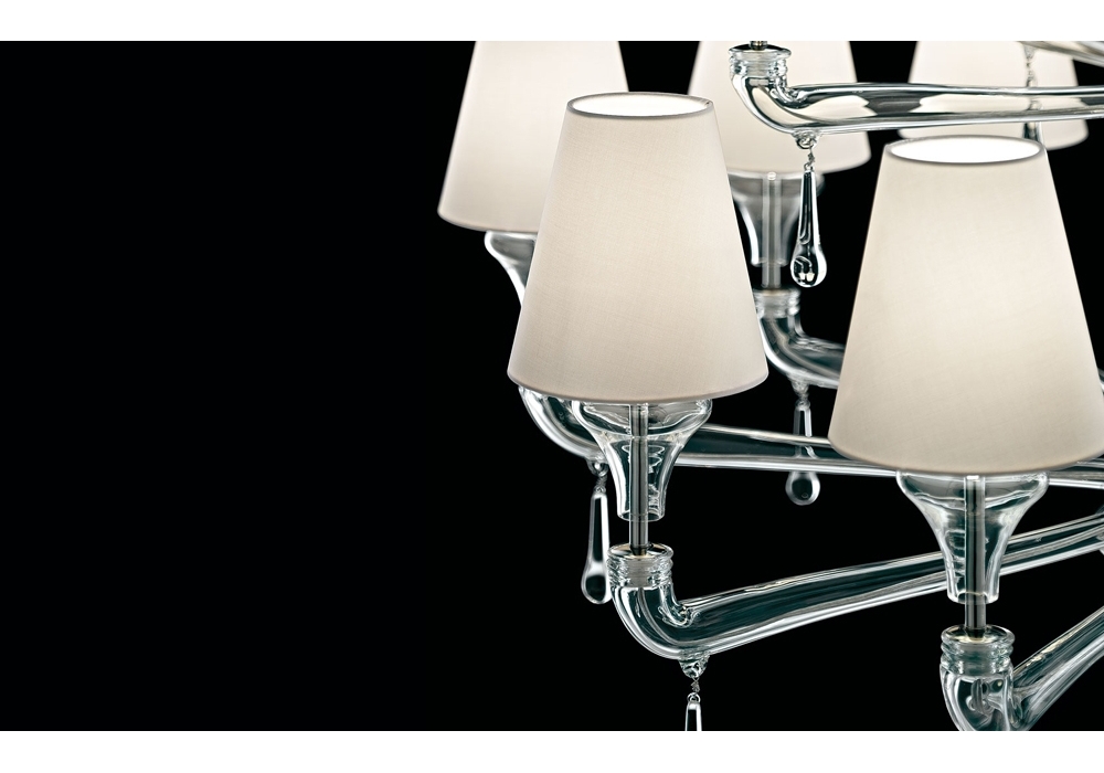 Nevada designed and produced by Barovier & Toso is a chandelier structured with overlapping levels with a metal frame covered in Venetian glass. The arms support fabric lampshades with dimmable LED or halogen light sources. Nevada is available in different models and finishes.
