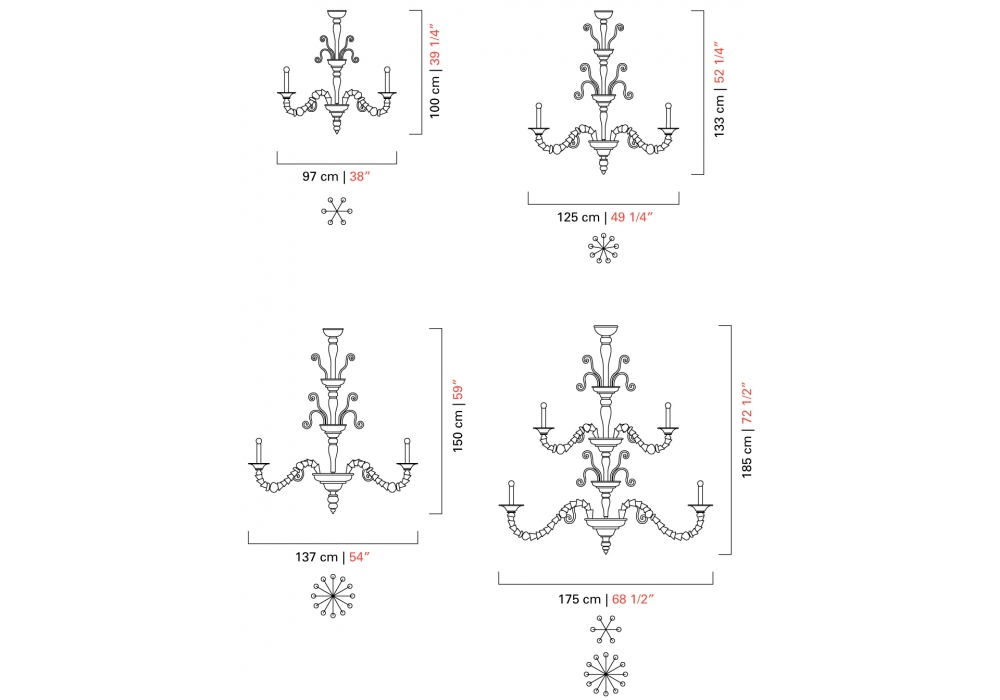 Baikal designed and produced by Barovier & Toso is a structured chandelier with 1 or more overlapping levels with a metal frame covered in Venetian glass. The arms support fabric lampshades with dimmable LED or halogen light sources. Baikal is available in different models and finishes.