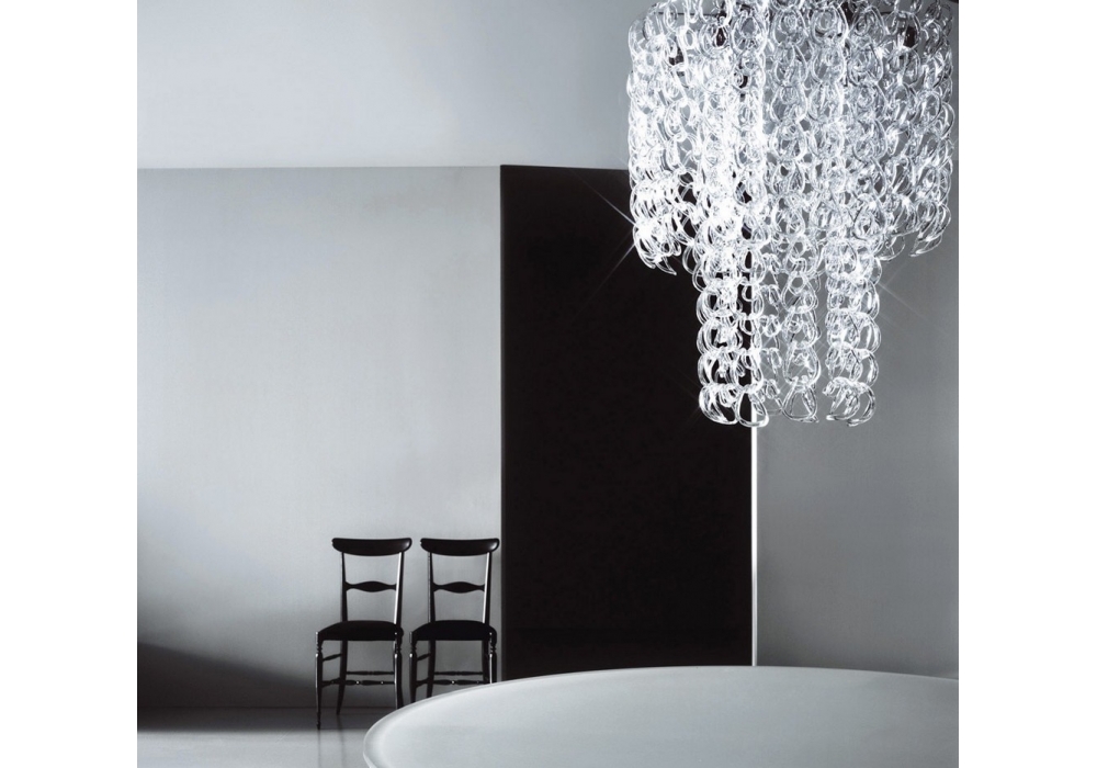 P-Light is a chandelier designed by Piero Lissoni for Porro .The P-Light chandelier is composed by transparent crystal elements entirely hand made, arranged on metal structures and available in two different sizes: 750 mm and 650 mm in diameter. The Vistosi of Murano glasswork exclusively makes the shape of the lamp.