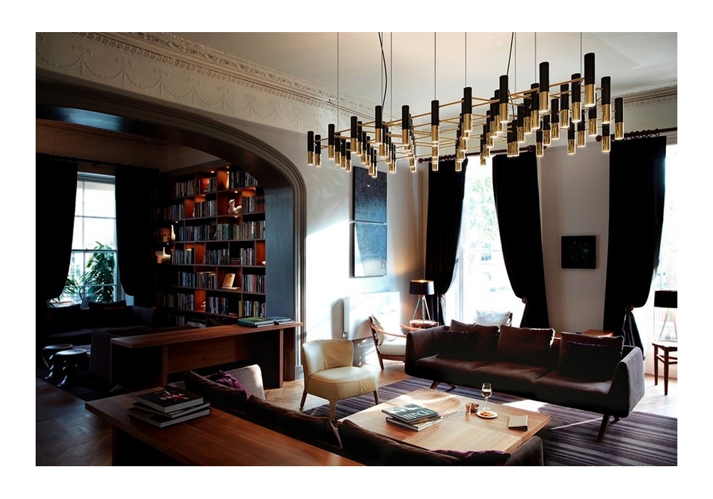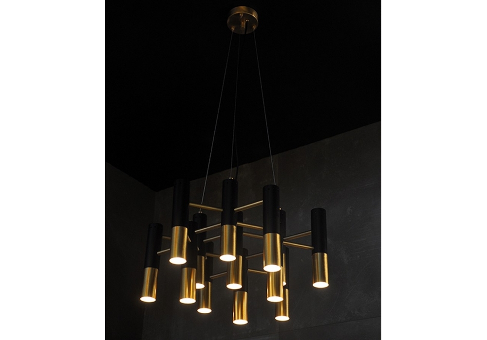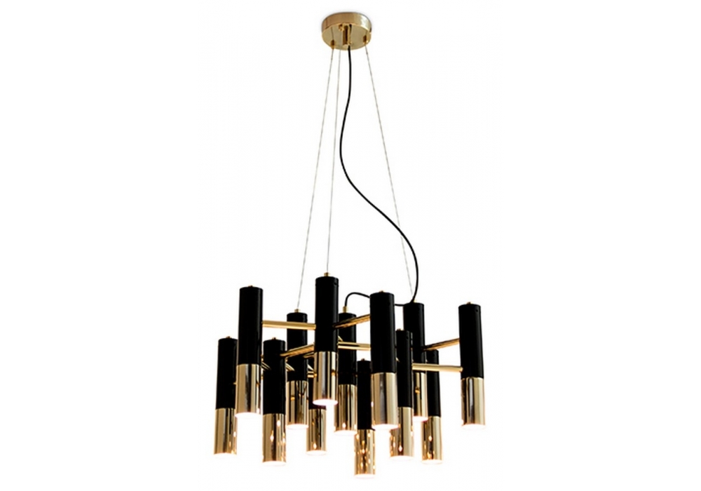 Ike Suspension designed by DelighFULL is a chandelier handcrafted in brass and aluminum and has a glossy black and gold plated finish. It can be customized in height. Highly recommended for use with a dimmer switch to cast a more even light.