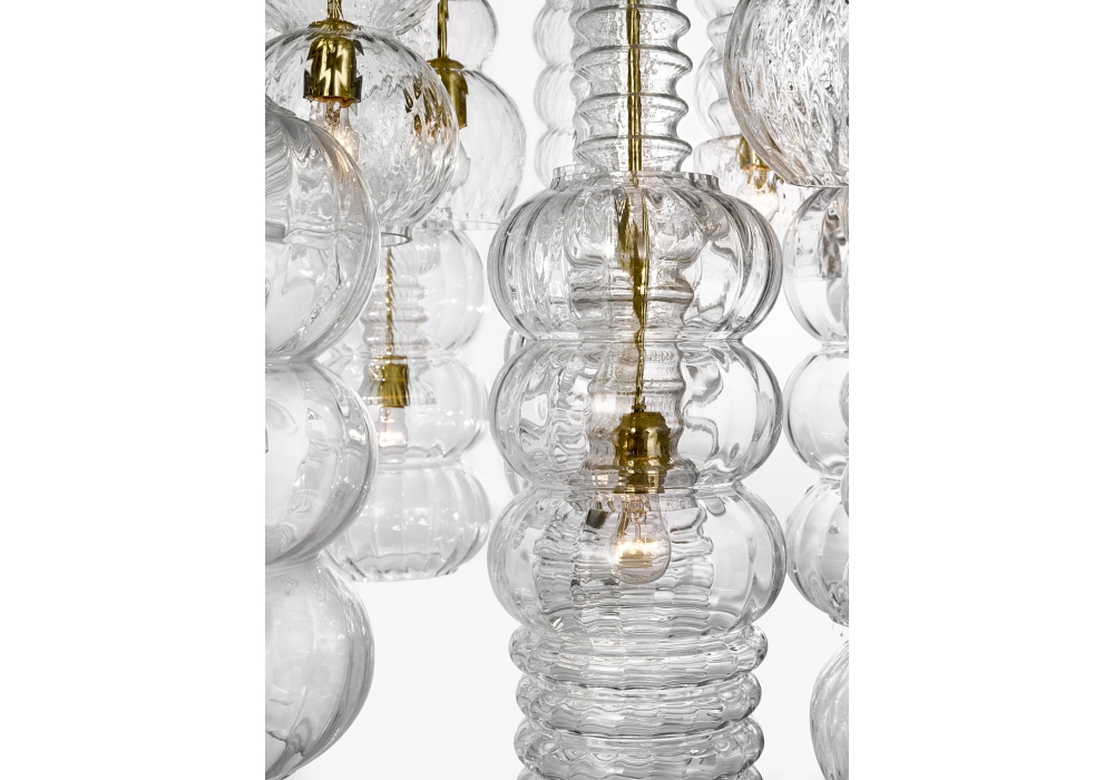 Praha esigned by Stanislav Libenský for Lasvit is a beautiful chandelier made of hand-blown glass and metal. Natural light creates a positive/negative image pattern directly on the glass. Amassing fixtures in a variety of shapes and heights enables diverse effects. These distinctive features, as well as variability of use, make the Praha lighting sculpture a timeless design.