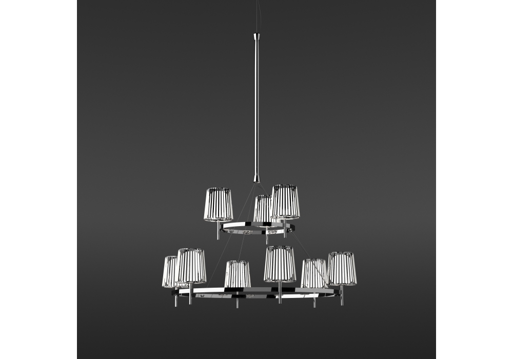 Julia designed by Daniel Becker for Quasar is a chandelier with black rosette and plate matching the lamp body. The circular metal supporting structure, in chrome or brass finishes. The lampshades are made of glass with a dimmable LED light source. Julia is available in different sizes.