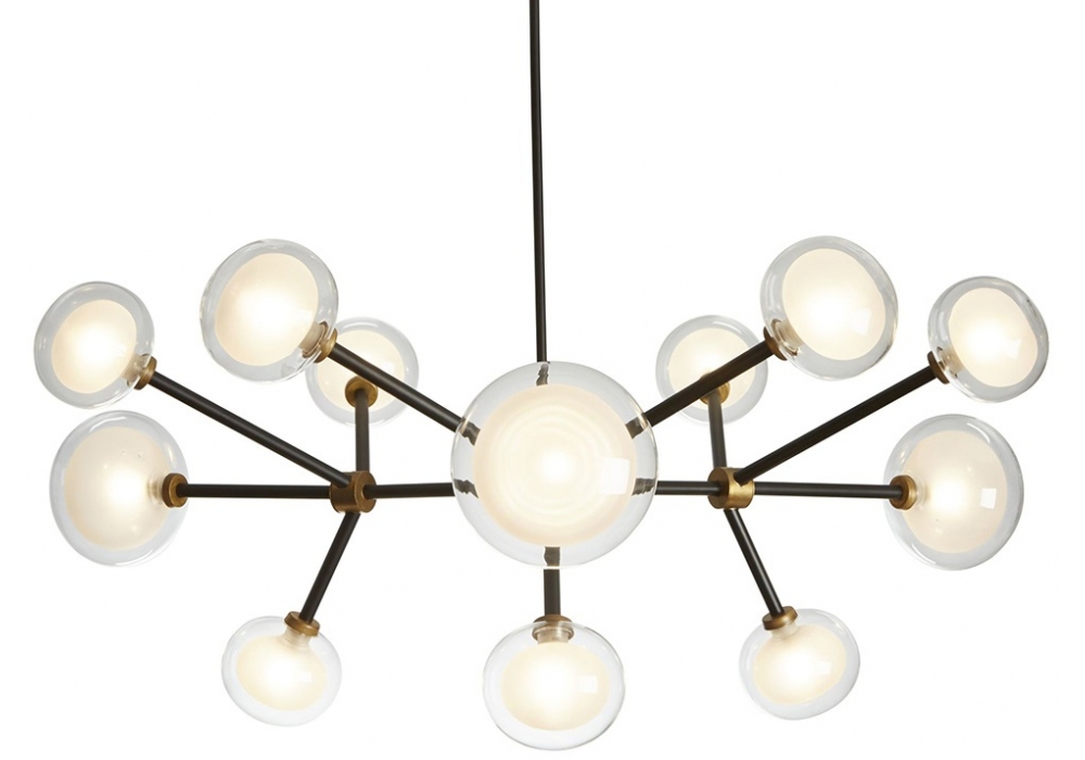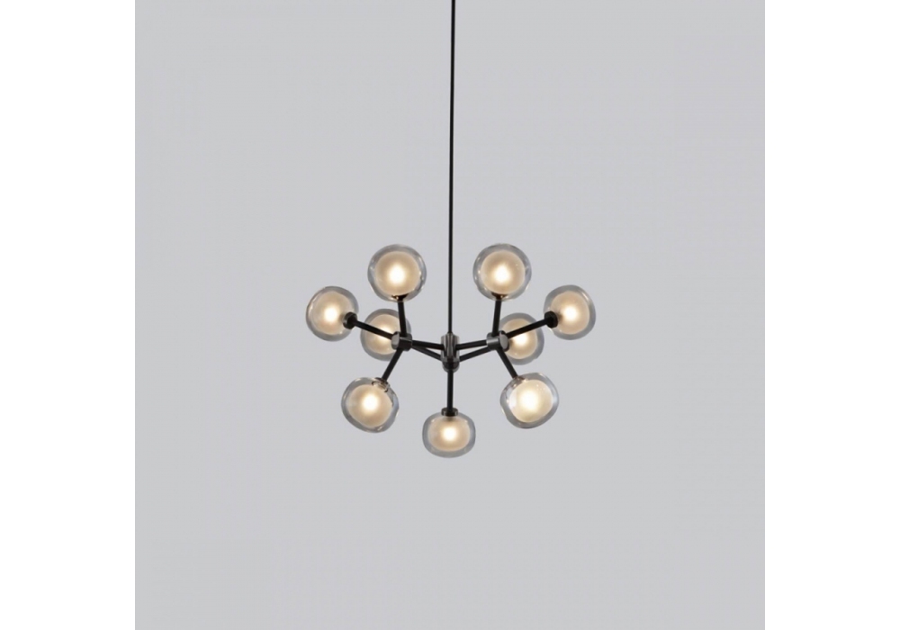 552 Nabila designed by Corrado Dotti for Tooy is a chandelier with matt black metal structure, brass details with transparent glass shade, black chrome details with smoked glass shade.