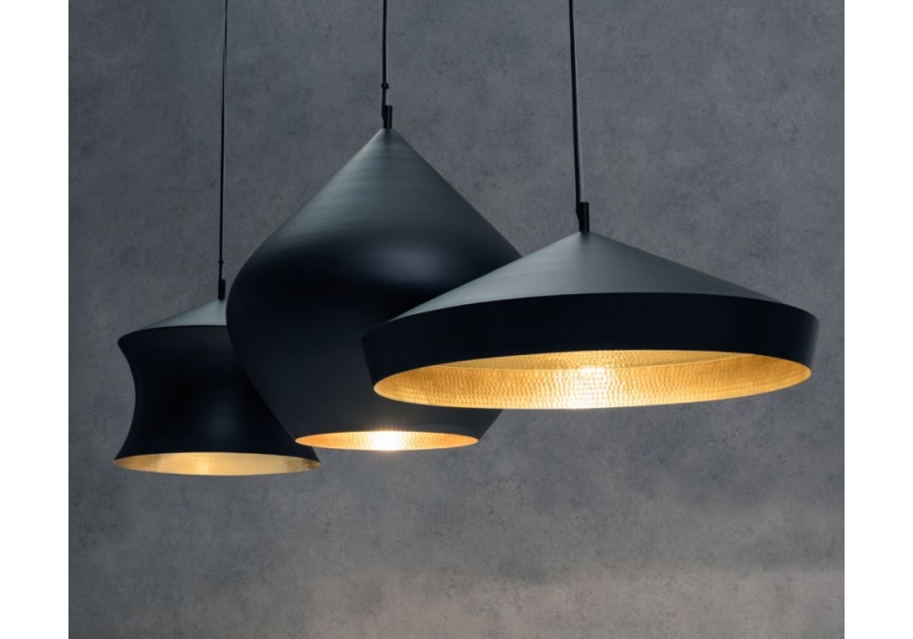 Beat Trio Linear designed by Tom Dixon is a suspension system in brass composed of three lamps in a single black finish.