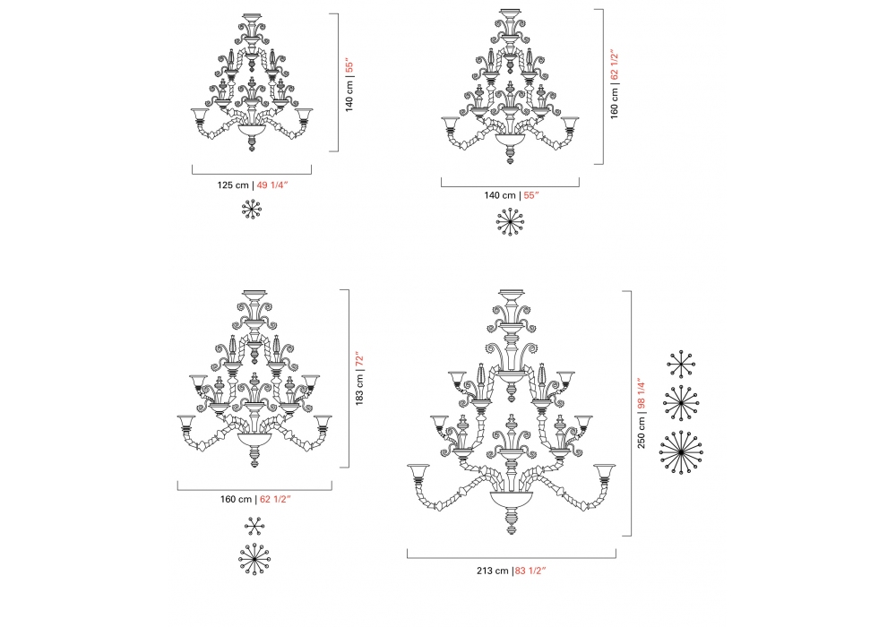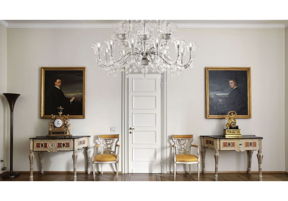 Venezia 1295 designed and produced by Barovier & Toso is a multi-level chandelier with supporting structure and details in galvanized gold-colored or polished chrome metal. The lamp body and the arms are covered in crystal-colored Venetian glass embellished with decorations and pendants always in transparent crystal. The light sources adopted are of the dimmable LED or halogen type. Venezia 1295 is available in different models and metal finishes.