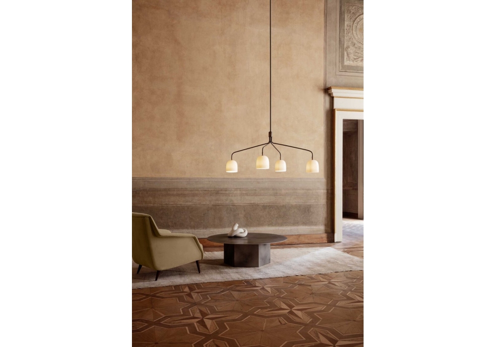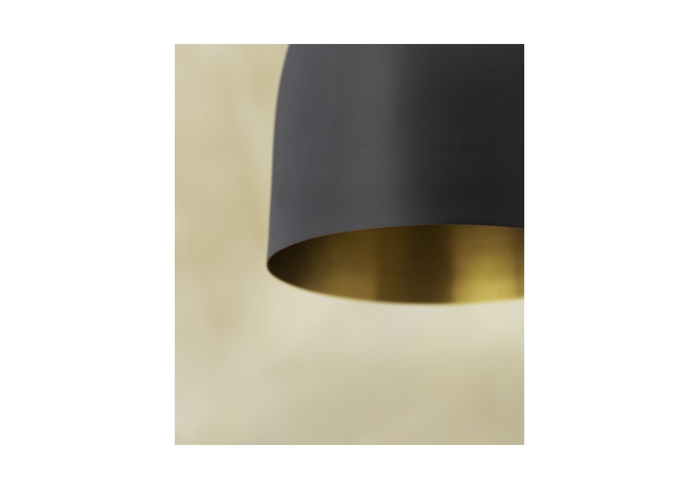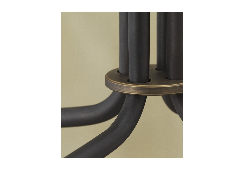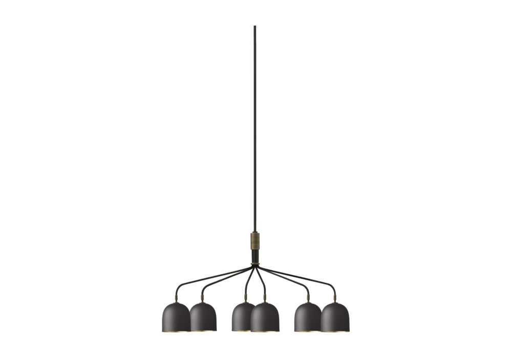 Howard designed by Space Copenhagen for Gubi is a chandelier with brass shades with a gunmetal finish and brushed brass interior or bone china shade. It is available with 4 or 6 lamp shades.