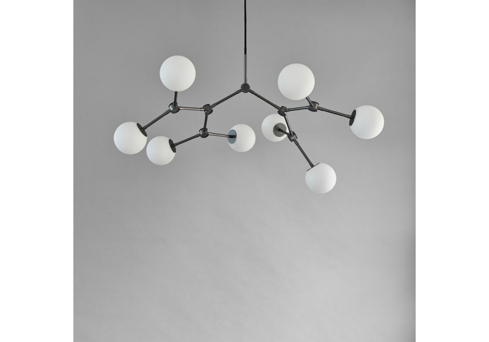 Drop Bulp Mini designed by Kristian Sofus Hansen & Tommy Hyldahl for 101 Copenhagen is a chandelier made of metal in gray finish and opal glass lampshades.