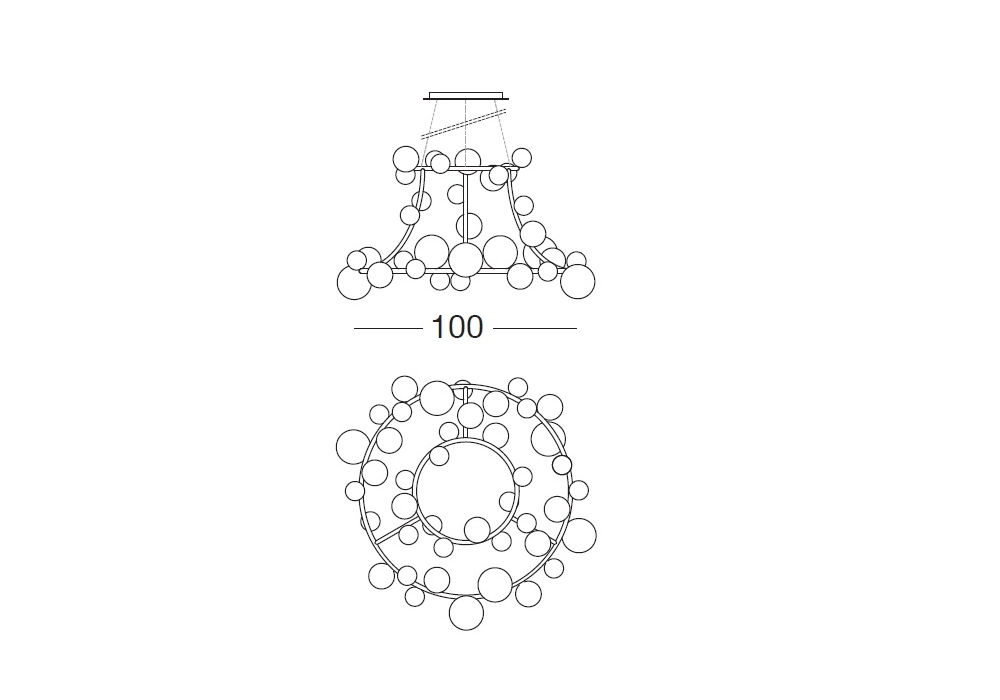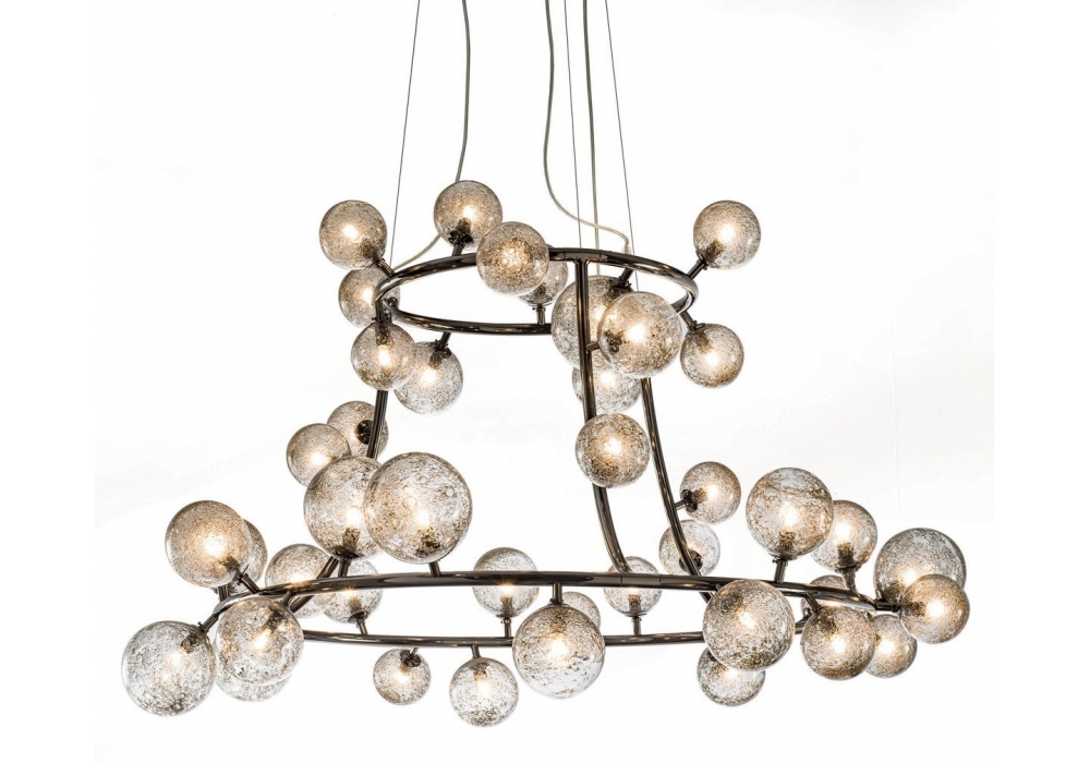 Ducale designed by Giuseppe Iasparra for Longhi is a round chandelier with metal structure in light gold and black nickel galvanic finishes. Blown glass spheres of different sizes with gold inserts for the light gold and brass structure for the black nickel finish version.