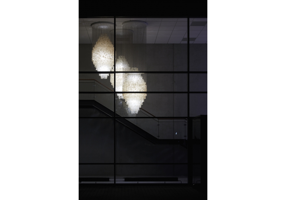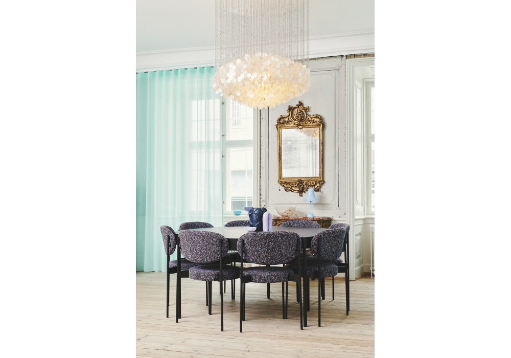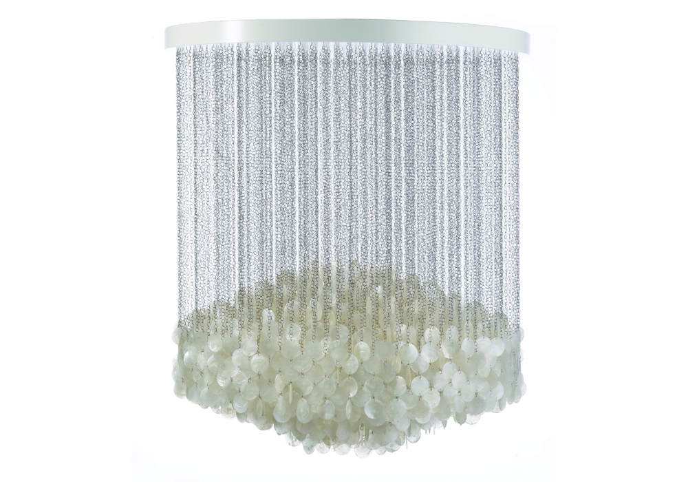 Fun designed by Verner Panton for Verpan is a chandelier characterized by mother-of-pearl discs on a metal frame. The discs are connected to each other thanks to small metal rings. Rosette in white wood and transparent suspension cable. Available in different models.