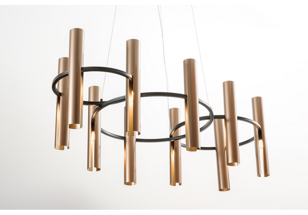 Reeds designed by Marcello Ziliani for Turri is a chandelier made up of three rings of different diameters which support ten aluminum tubes for the Ø 120 x H 40 cm size or in acid-etched glass for the Ø 80 x H 40 cm, fitted in correspondence with the light sources thanks to lateral slits.