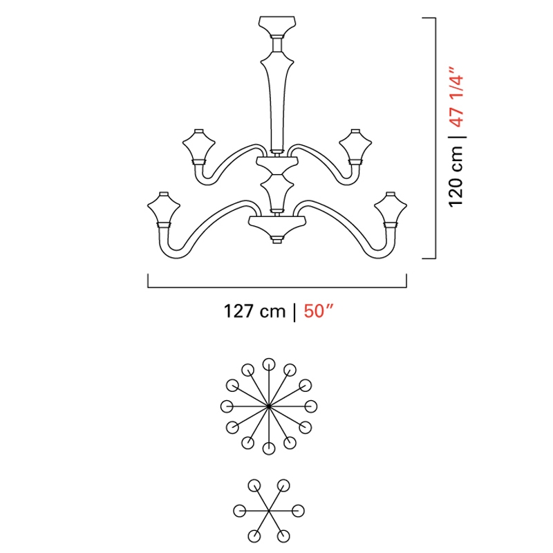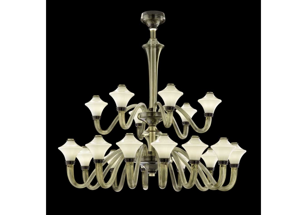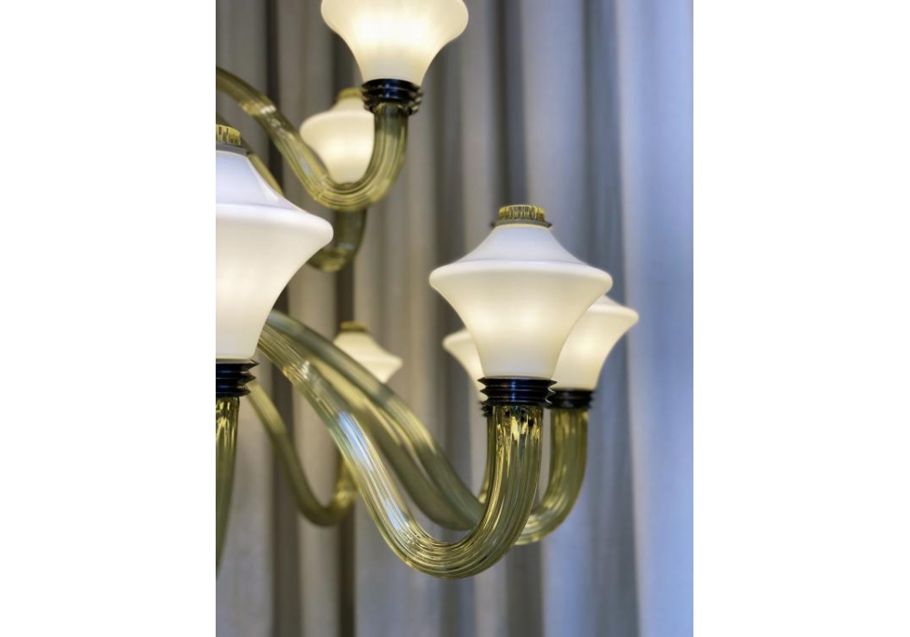 Metropolis designed and produced by Barovier & Toso is a chandelier made with 1 or more levels with supporting structure and details in brushed black nickel or brushed gold metal. The lamp body and the arms are covered in Venetian glass with a striped surface. The light sources adopted are of the dimmable LED type. Metropolis is available in different models and finishes.
