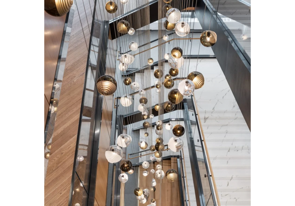 Dark & Bright Star designed by Dechem Studio for Bomma is a chandelier with mouth-blown crystal diffusers. It is available in different finishes and dimensions.