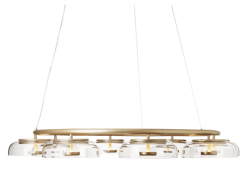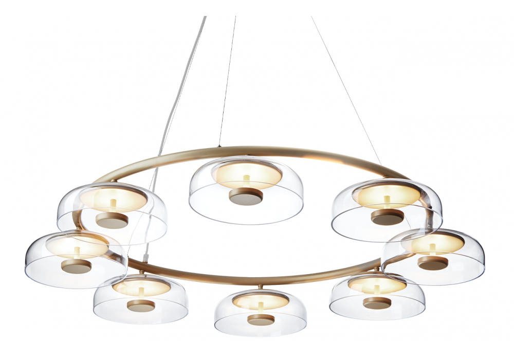 Blossi designed by Sofie Refer for Nuura is a chandelier characterized by a metal ring in Nordic gold finish and 6 or 8 diffusers in transparent blown glass.