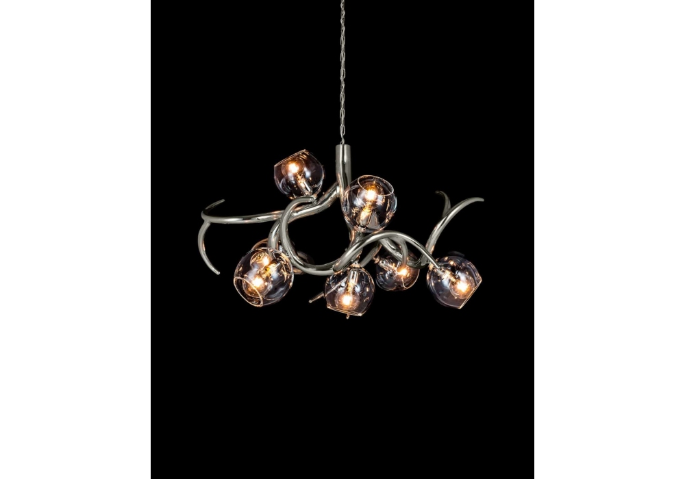 Ersa designed by William Brand for Brand Van Egmond is a chandelier made with metal structure and iridescent glass diffusers. Available in different finishes and dimensions. Upon request, the spheres can be made in translucent bronze or transparent glass.