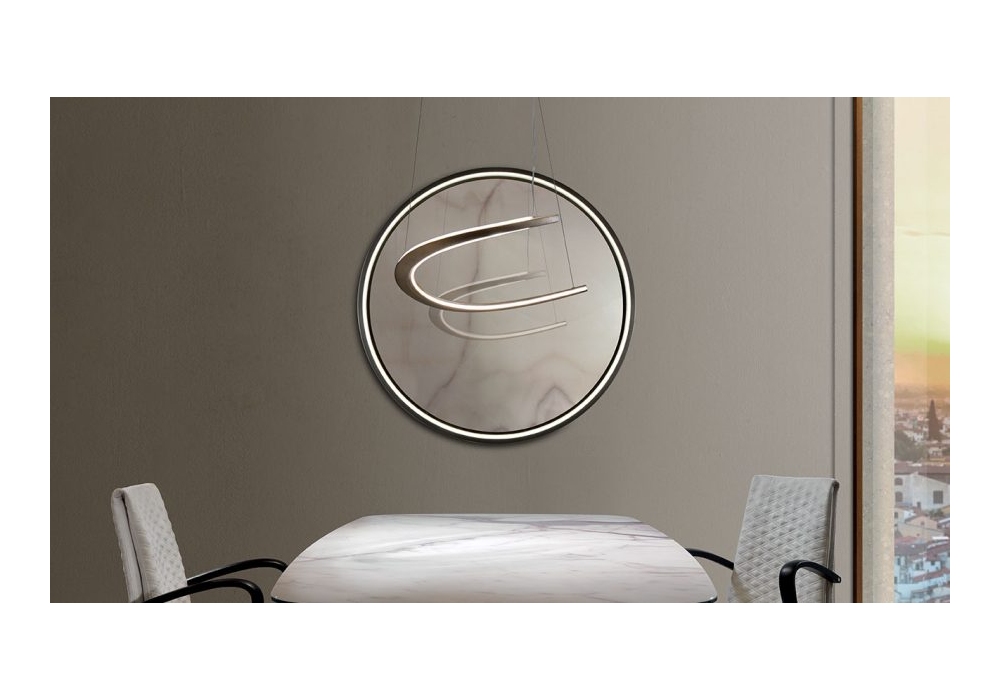 Speedform designed by Pininfarina for Reflex Angelo is a chandelier with mirrored glass support with built-in LEDs (6 x 3W 12V 2700-3000K) and cable cover frame. Curved polyurethane elements with LEDs (24W STRIP 12V 2700-3000K per element).