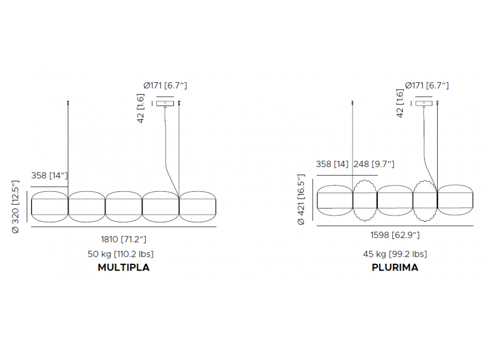 | Dimensions | Multipla_ 181 x 32 x H 32 cm; Plurima_ 159.8 x 42.1 x H 42.1 cm. |